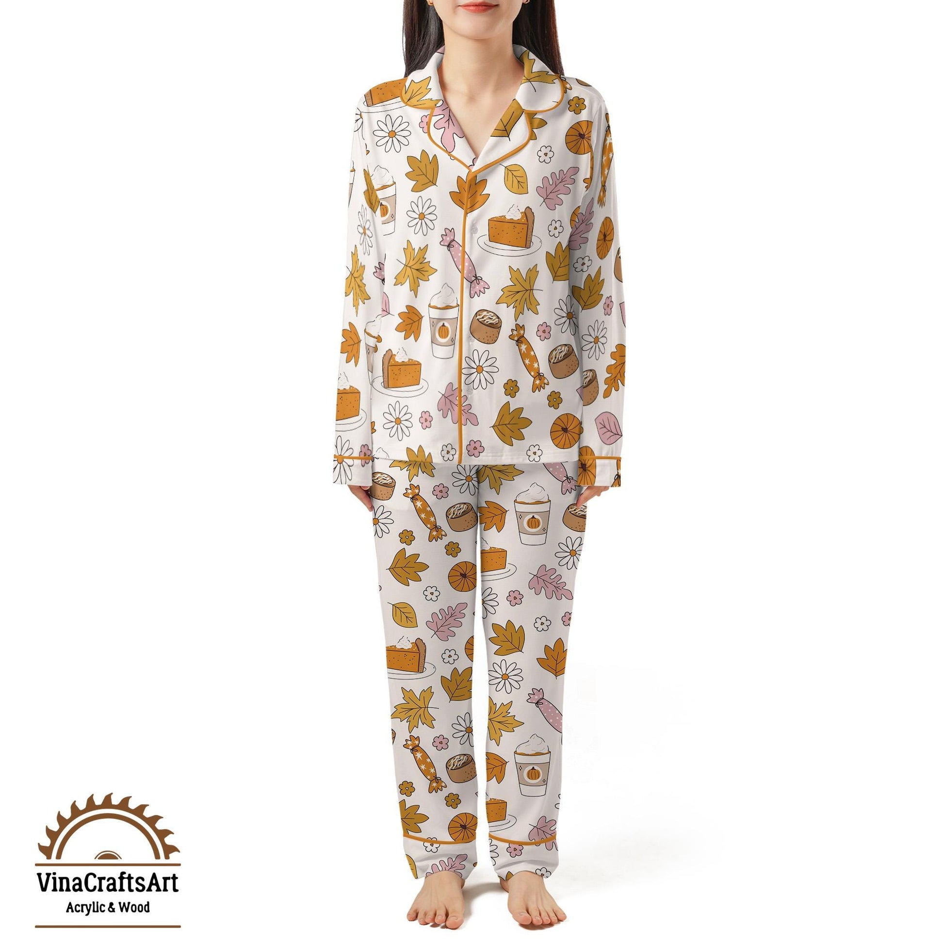 Fall Pajama Set – Pumpkin Spice & Autumn Leaves PJs, Cozy Thanksgiving Sleepwear, Cute Fall Loungewear for Women, Soft Pajamas Gift