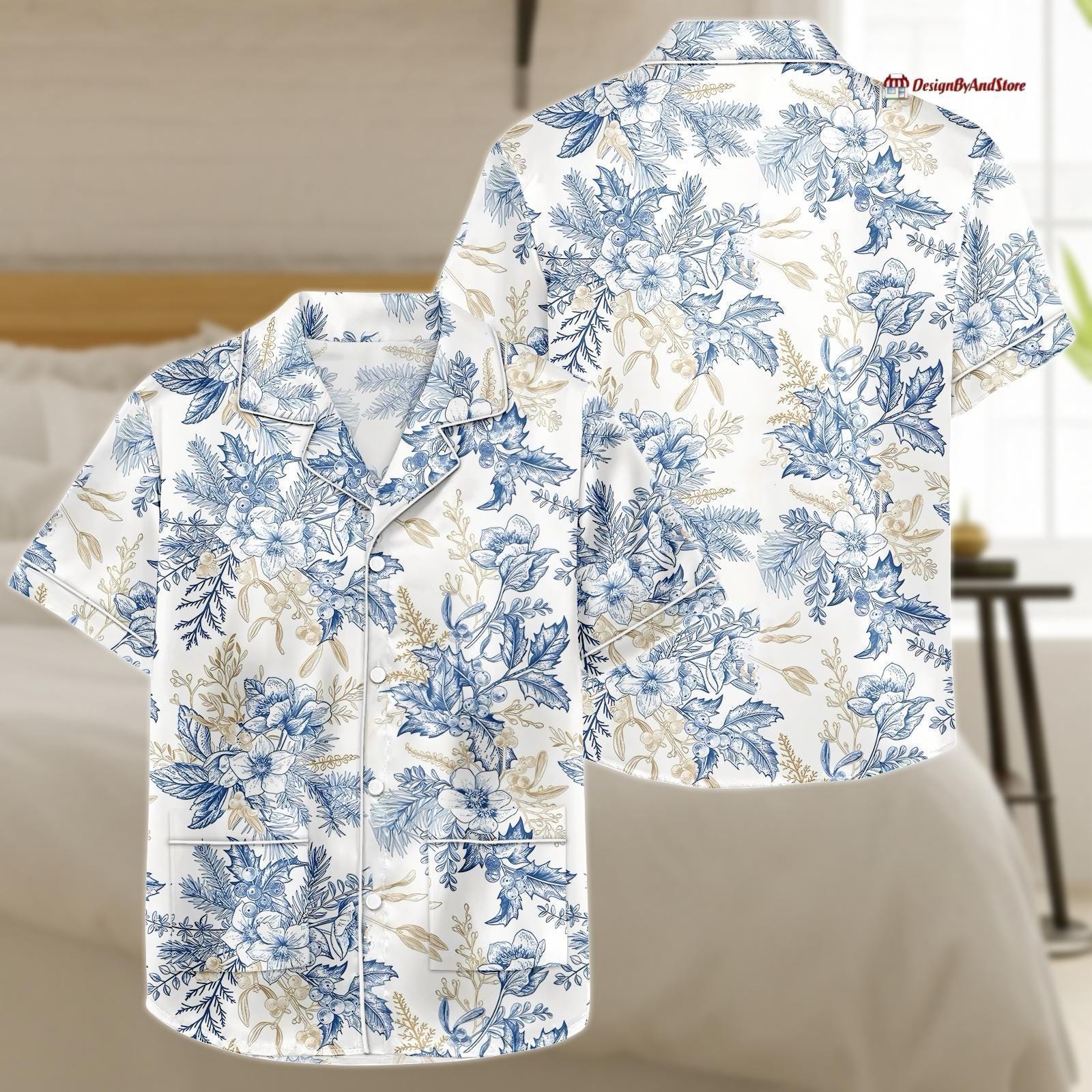 Flower Leaf Pajama Set, Summer Matching Short Sleeve Shirt and Shorts PJs, Loungewear for Women, Gift for Her