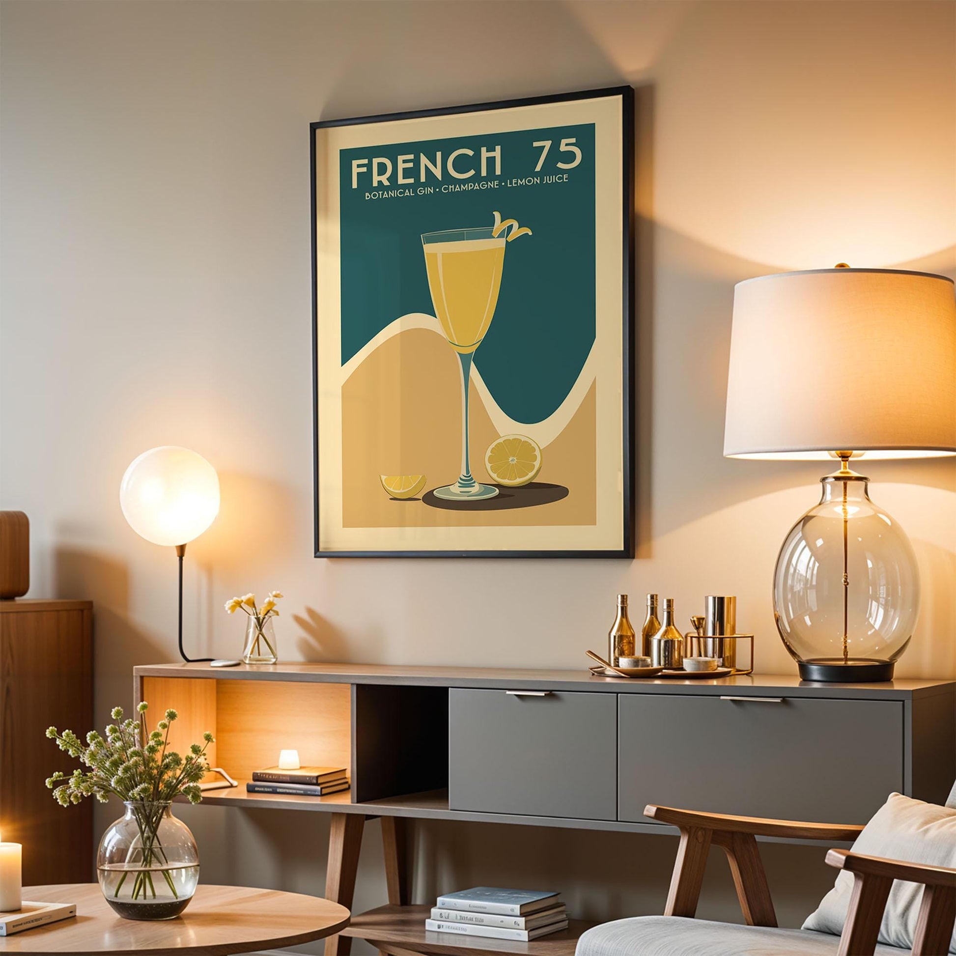 French 75 Cocktail Print, Vintage French 75 Cocktail Poster | Bar Cart Prints | Mid Century Modern Alcohol Poster for Home Bar Cart
