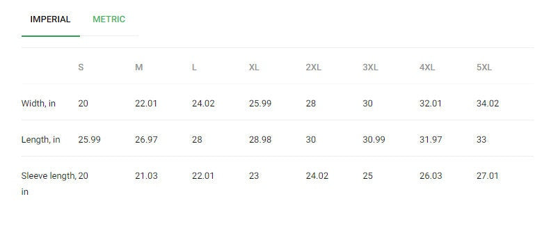 US Size | Chest (Inch) | Chest (Cm) | Length (Inch) | Length (Cm) | Sleeve (Inch) | Sleeve (Cm) |