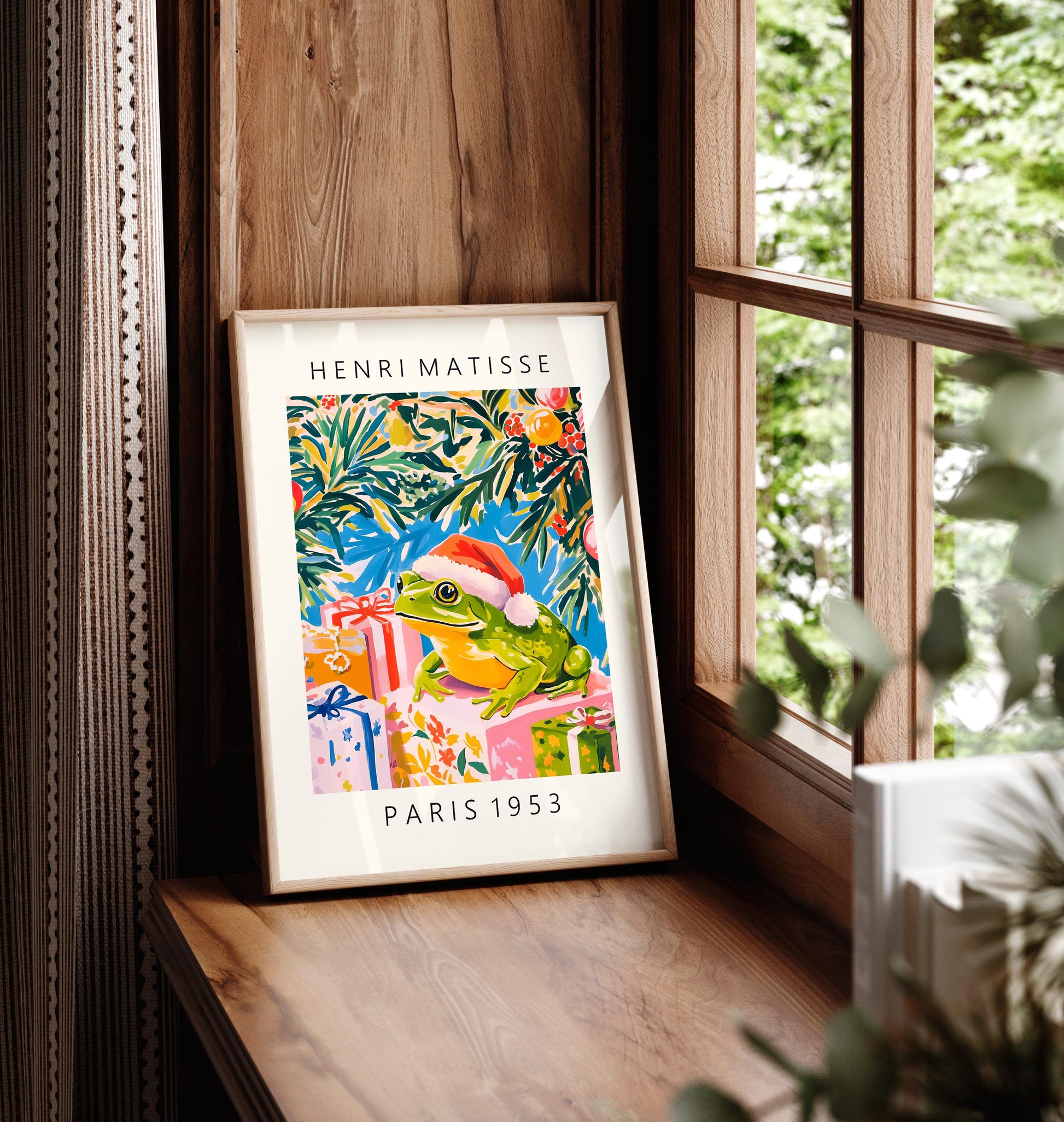 Frog in Santa Hat Art Print: Funny Matisse Style Christmas Decor