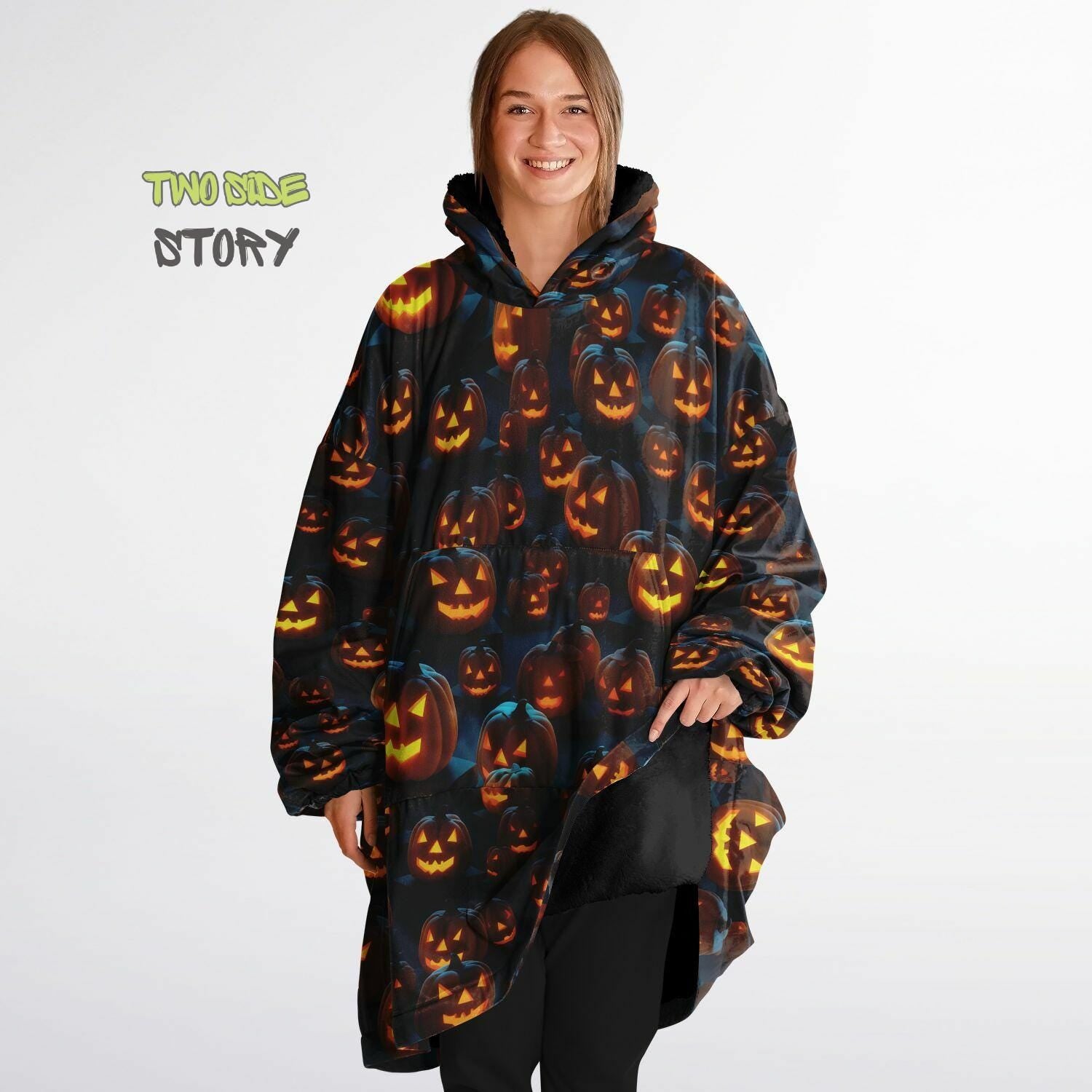 Fun Halloween Glowing Pumpkin Snug Hoodie,Printed Hooded Blanket,Blanket Sleeves,Lounge Wear,Novelty Birthday Christmas Gifts for Him or Her