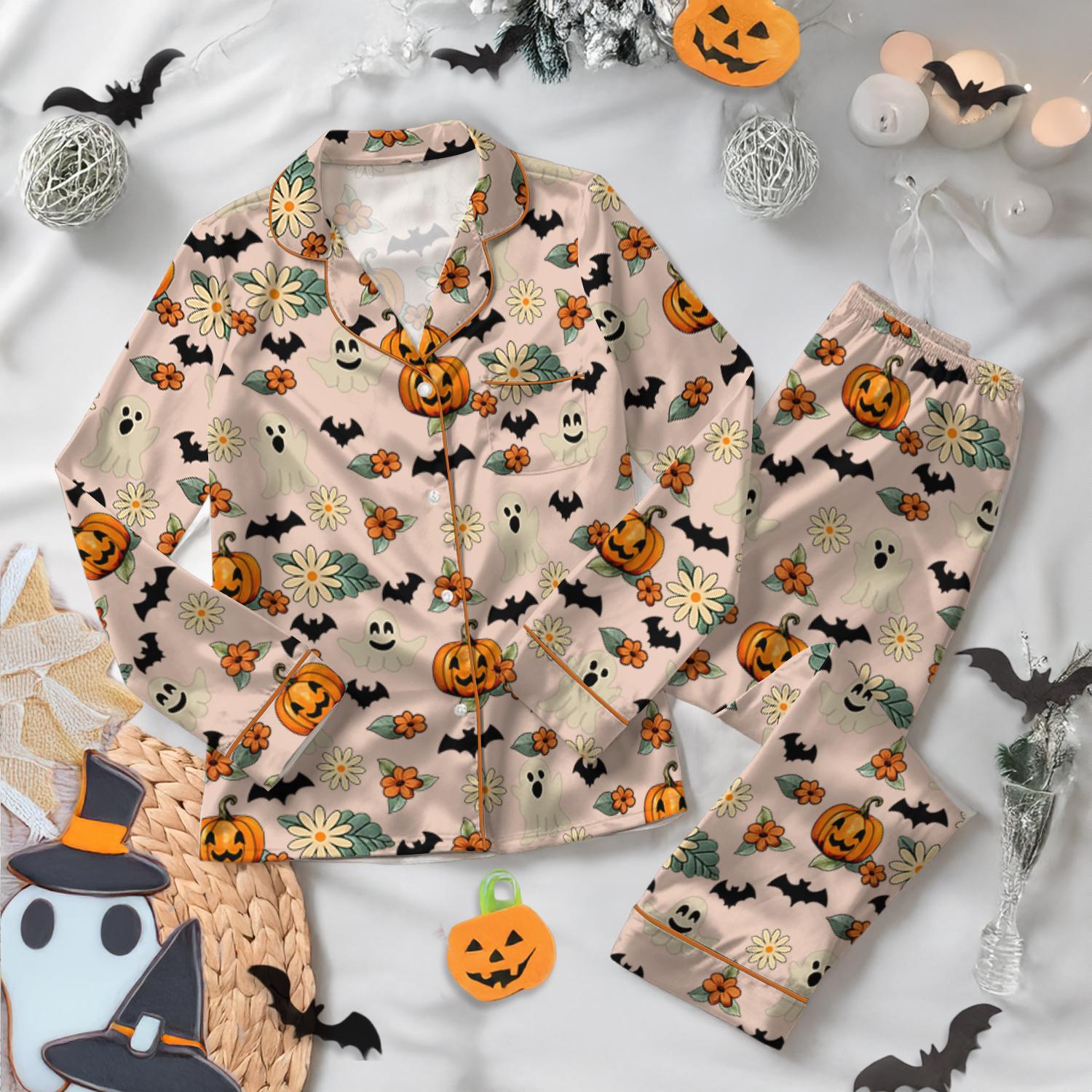 Funny Trick Or Treat Halloween Satin Pajamas, Floral Pumpkin Ghost Halloween Pajamas, Spooky Season Fall Vibes, Happy Halloween Sleepwear