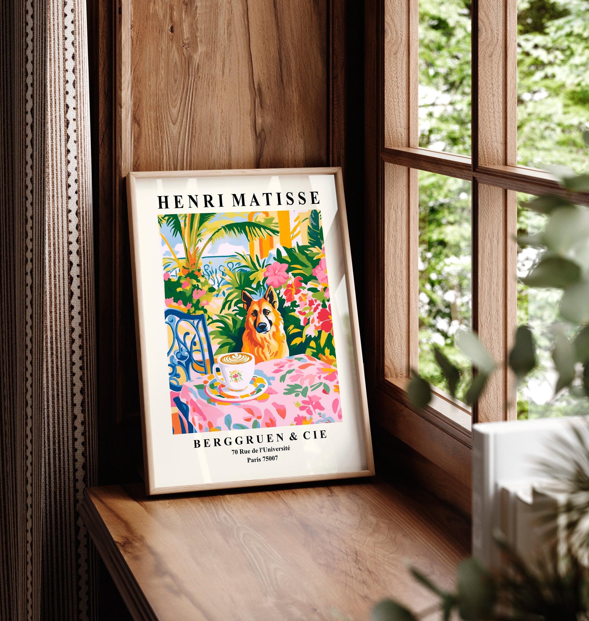 German Shepherd Dronking Coffee Art Print: Matisse Style Dopamine Decor