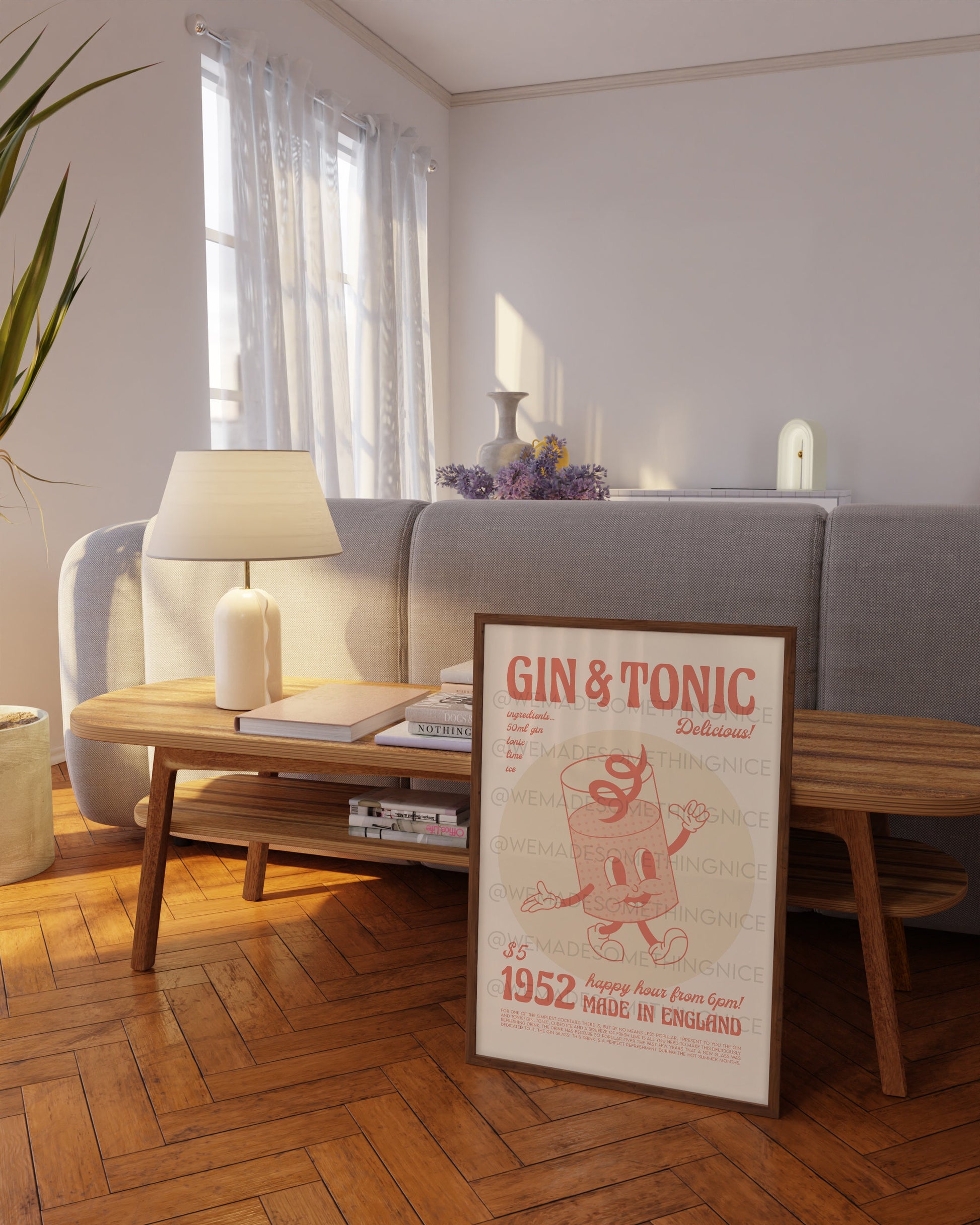 Gin and Tonic Print, Gin Poster, Kitchen Decor, Bar Art, Cocktail Poster, Mid Century Modern, Illustration, Birthday Housewarming