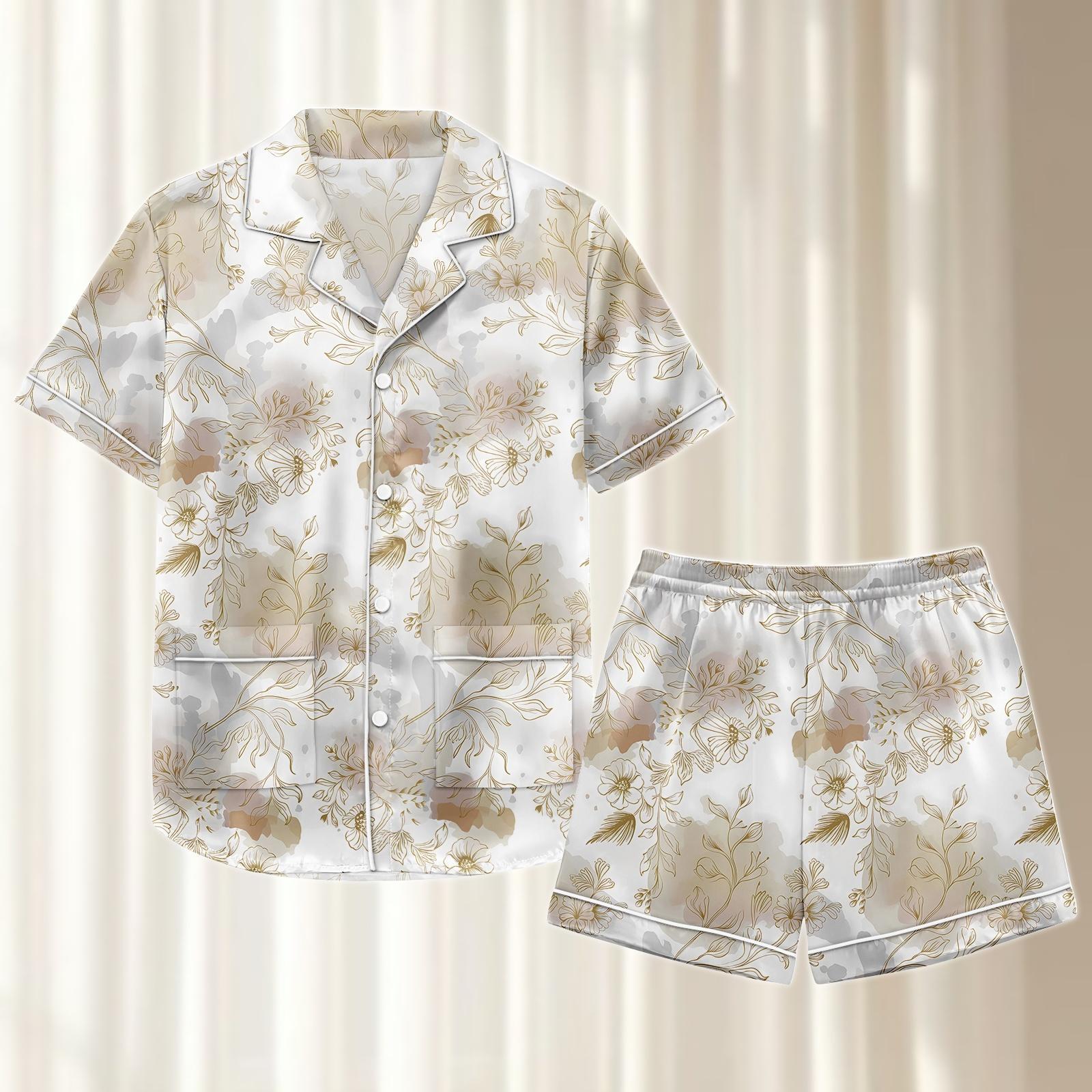 Gold Floral Satin Pajama Set, Elegant Gray Botanical Sleepwear, Women Loungewear, Vintage Matching Pjs, Birthday Gift For Her
