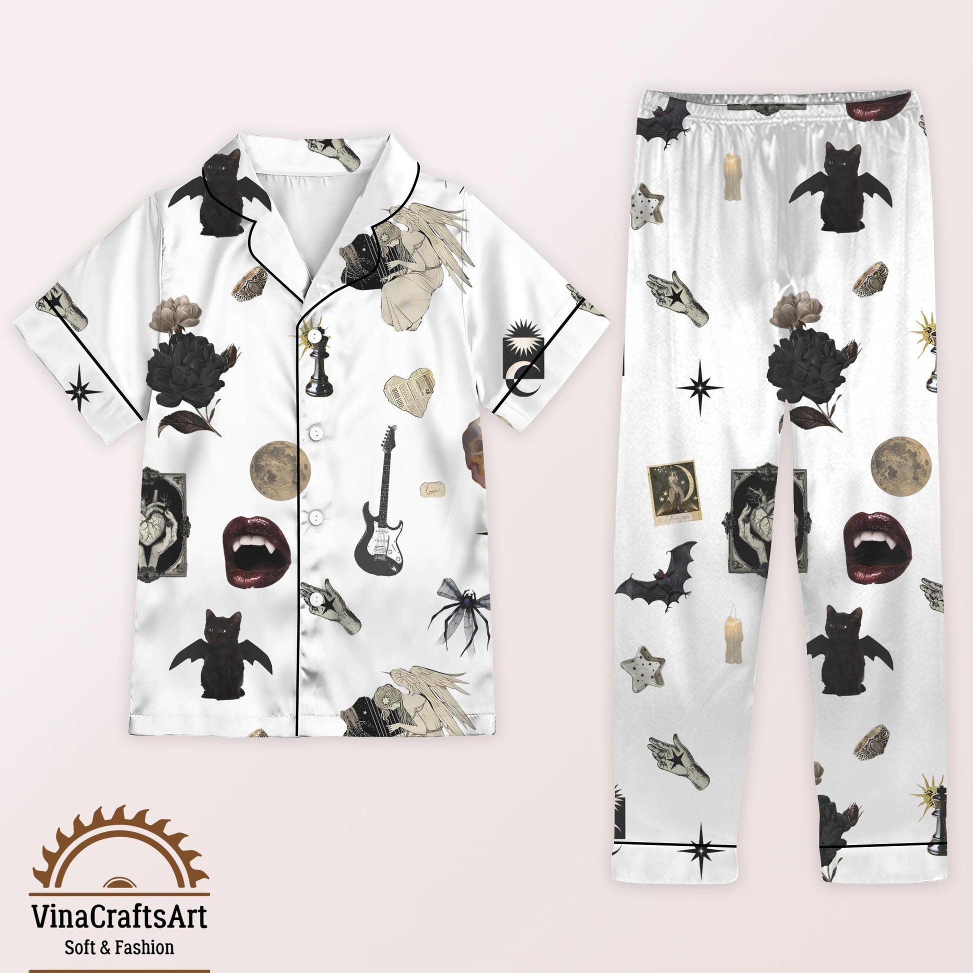 Gothic Pajamas Set, Vampire Bat Skull Moon Pajamas Set, Dark Aesthetic Sleepwear, Rock and Roll Loungewear, Spooky pajamas Set