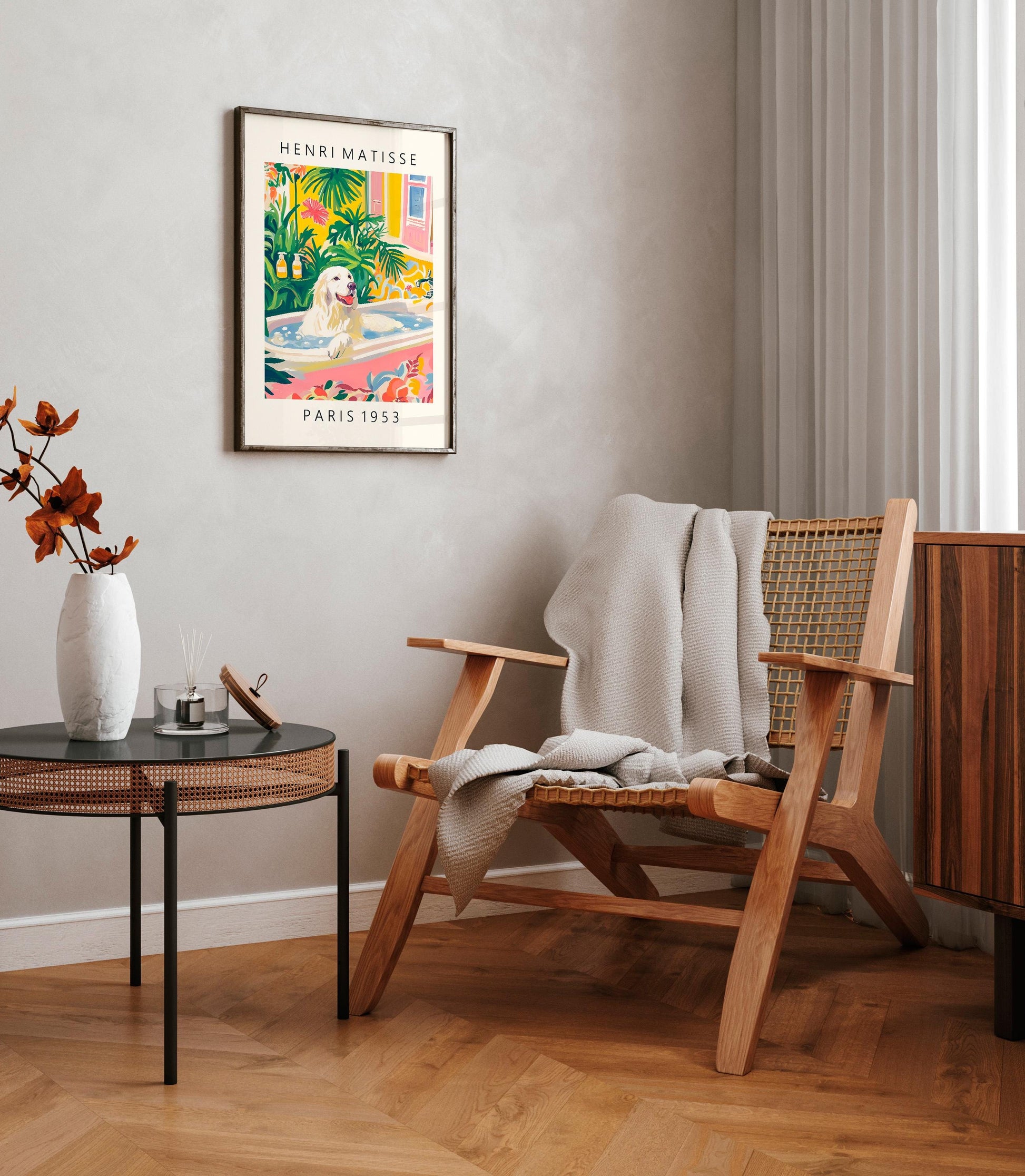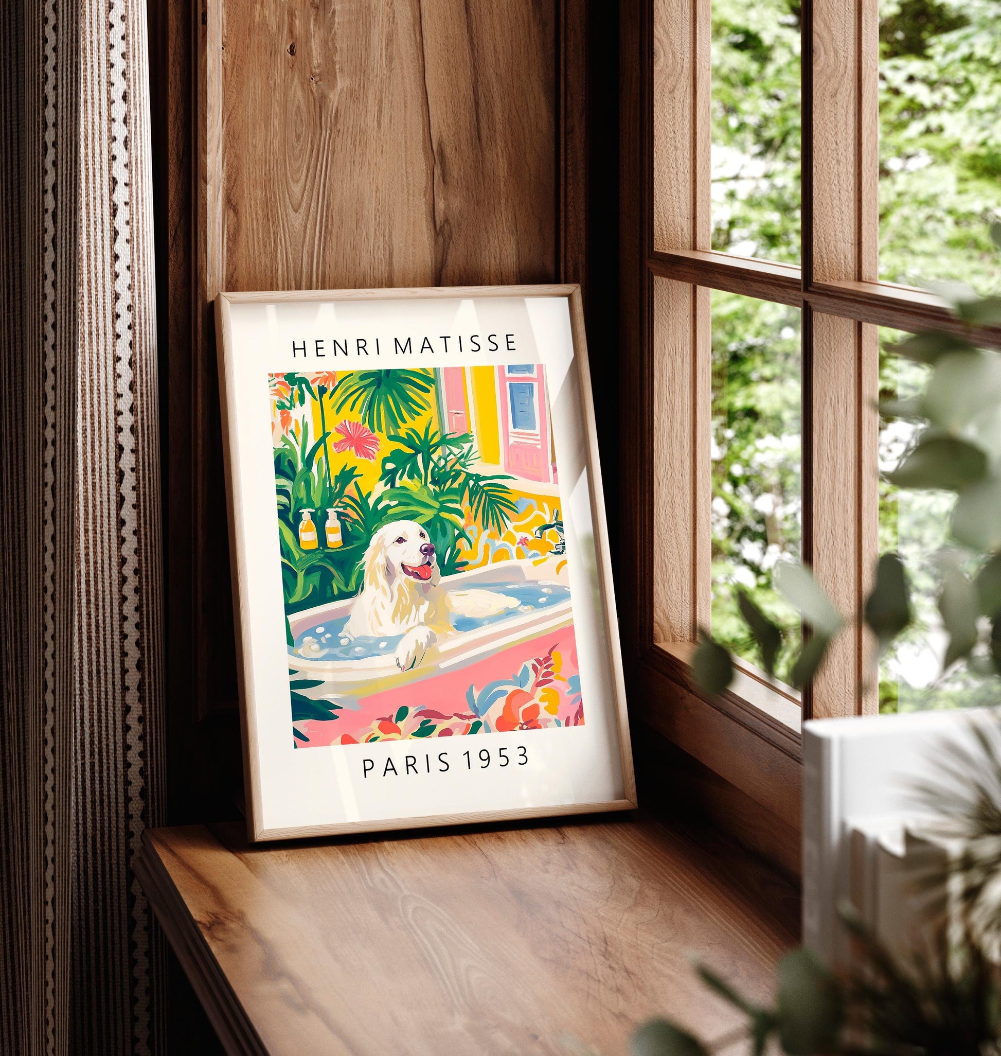 Great Pyrenees in bathtub, Matisse wall art, Funny bathroom poster for dog lovers, Pink dopamine decor, Dog art print