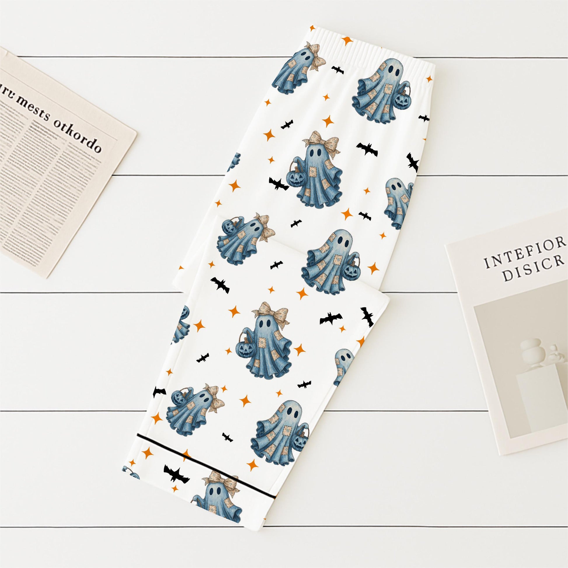 Halloween Blue Ghost Pajamas Set, Halloween Ghost With Bats Sleepwear, Cozy Fall Loungewear, Halloween Pattern Homewear, Halloween Gift