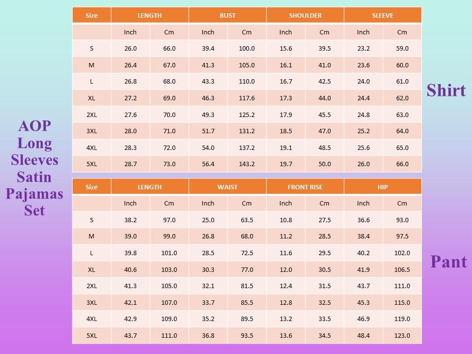 | 1/2 Chest (in/cm) | Length (in/cm) | Sleeve (in/cm) | Waist (in/cm) | Length (in/cm) | Inseam (in/cm) | |