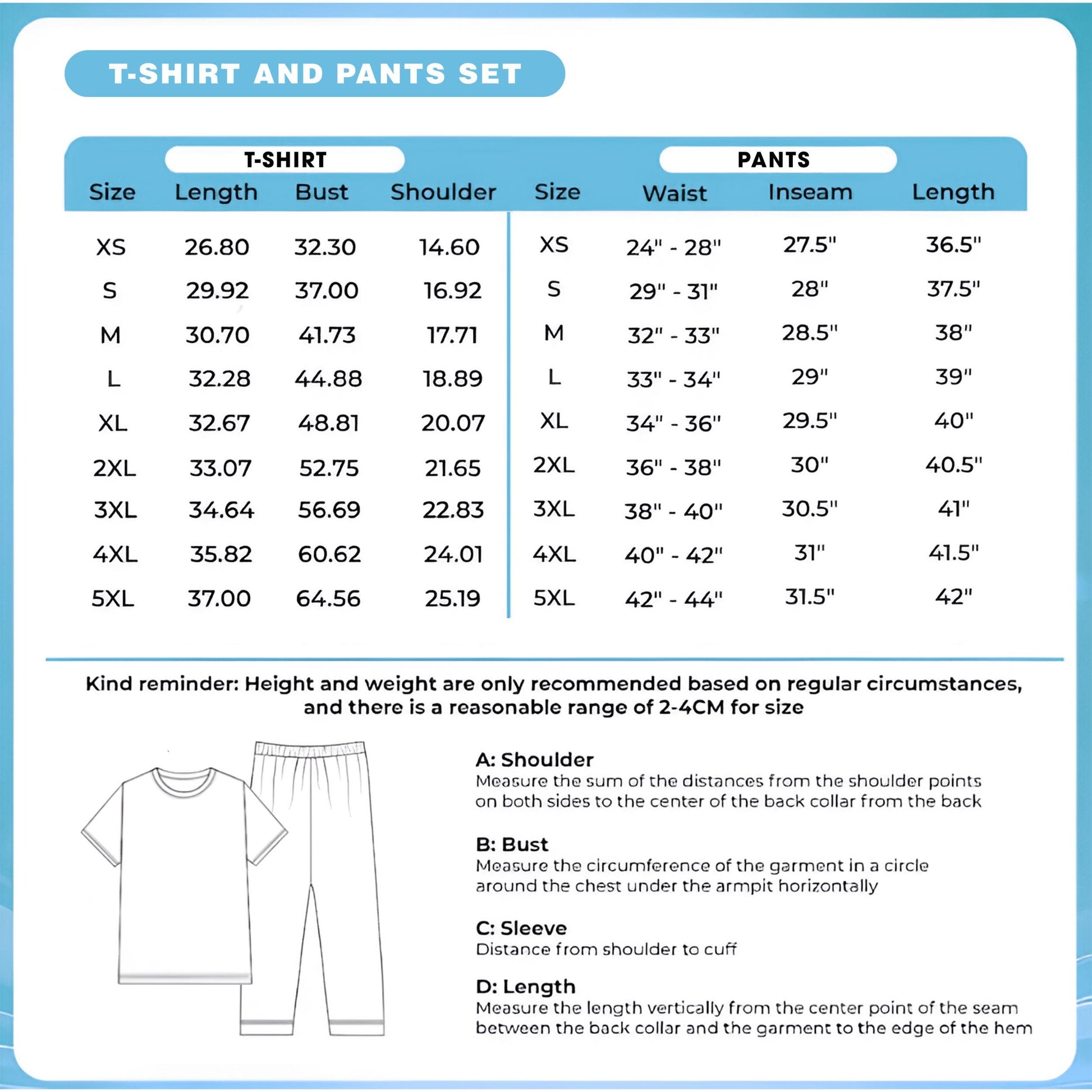 | Size | Shirt | Pants | |||||