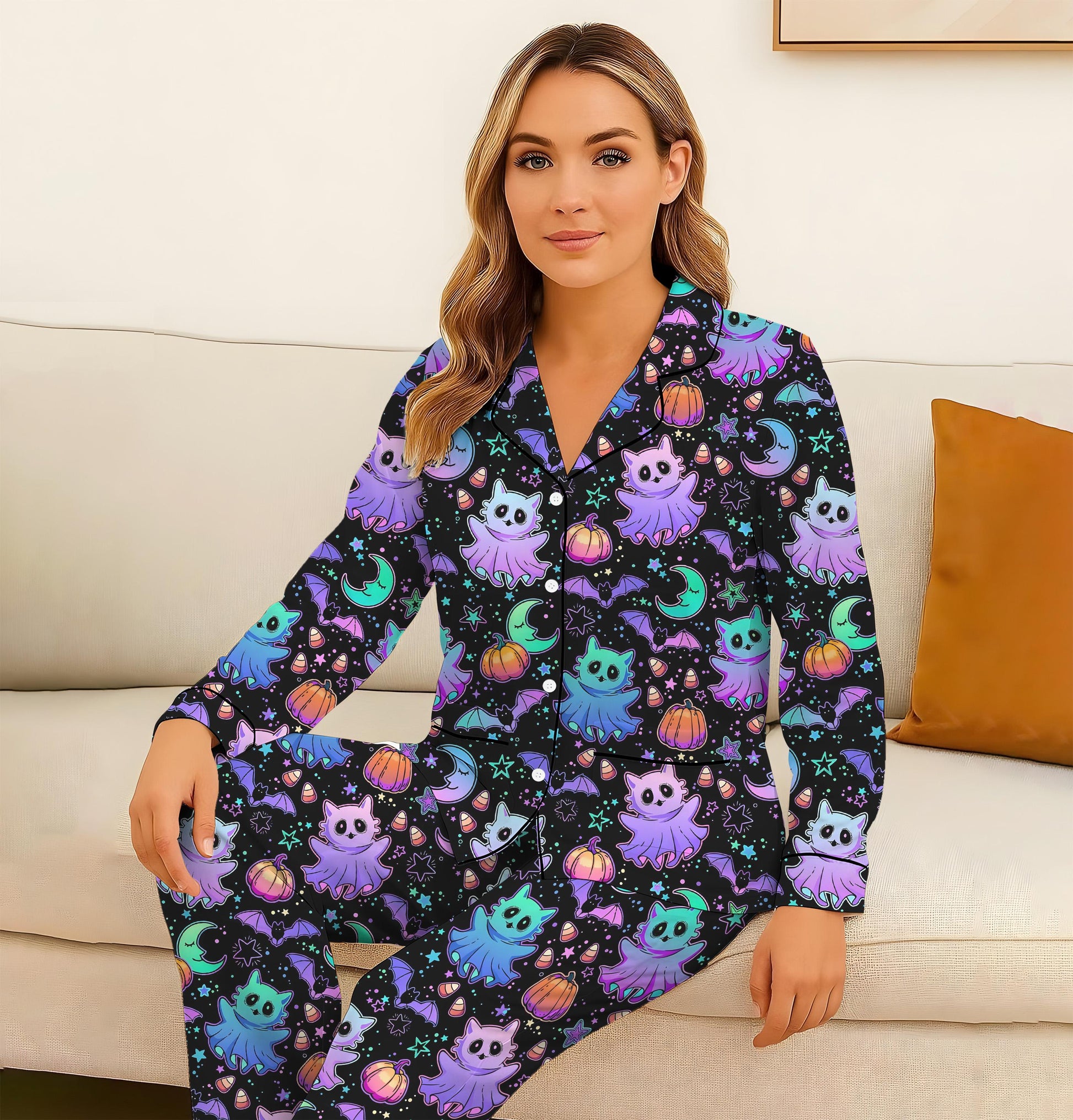 Halloween Neon Witch Cat Pumpkin Bat Pajamas Set, Neon Halloween Sleepwear, Halloween Night Homewear, Cozy Loungewear, Spooky Season Gift