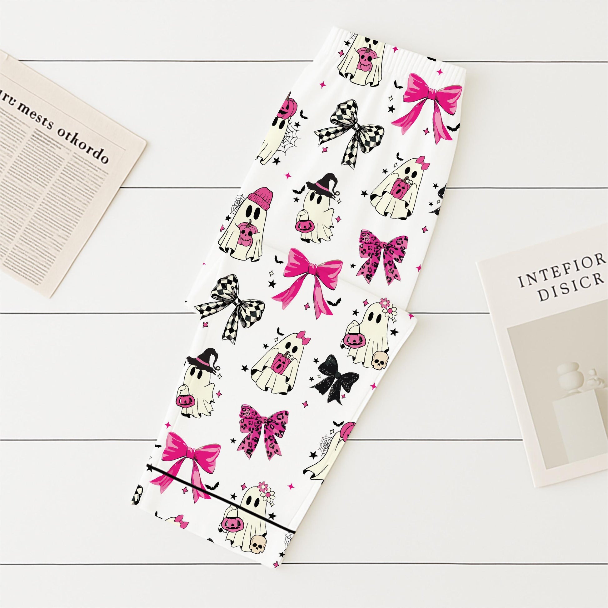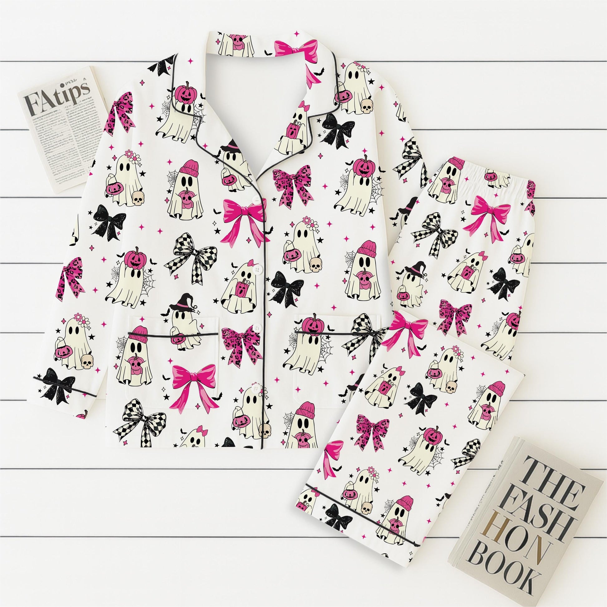 Halloween Pink Ghost And Bow Pajamas Set, Halloween Ghost Sleepwear, Fall Loungewear, Cozy Homewear, Spooky Season Gift, Halloween Gift