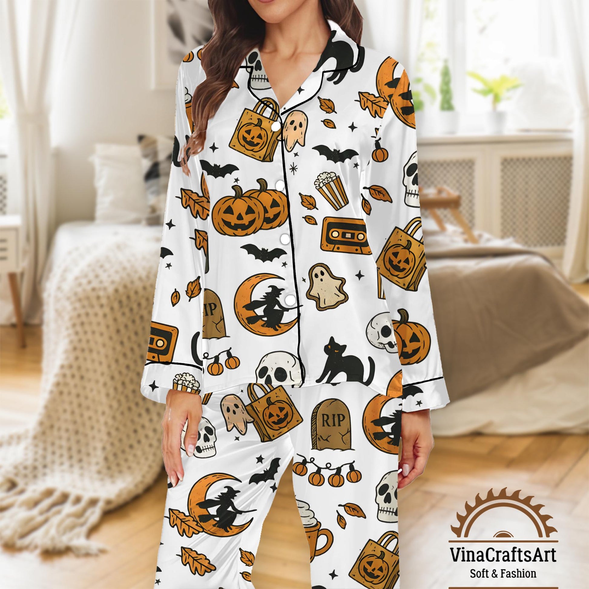 Halloween Pumpkin Pajamas Set, Pumpkin Ghost Witch Cat Print Sleepwear, Spooky Cute Loungewear, Spooky Season Pajamas Set
