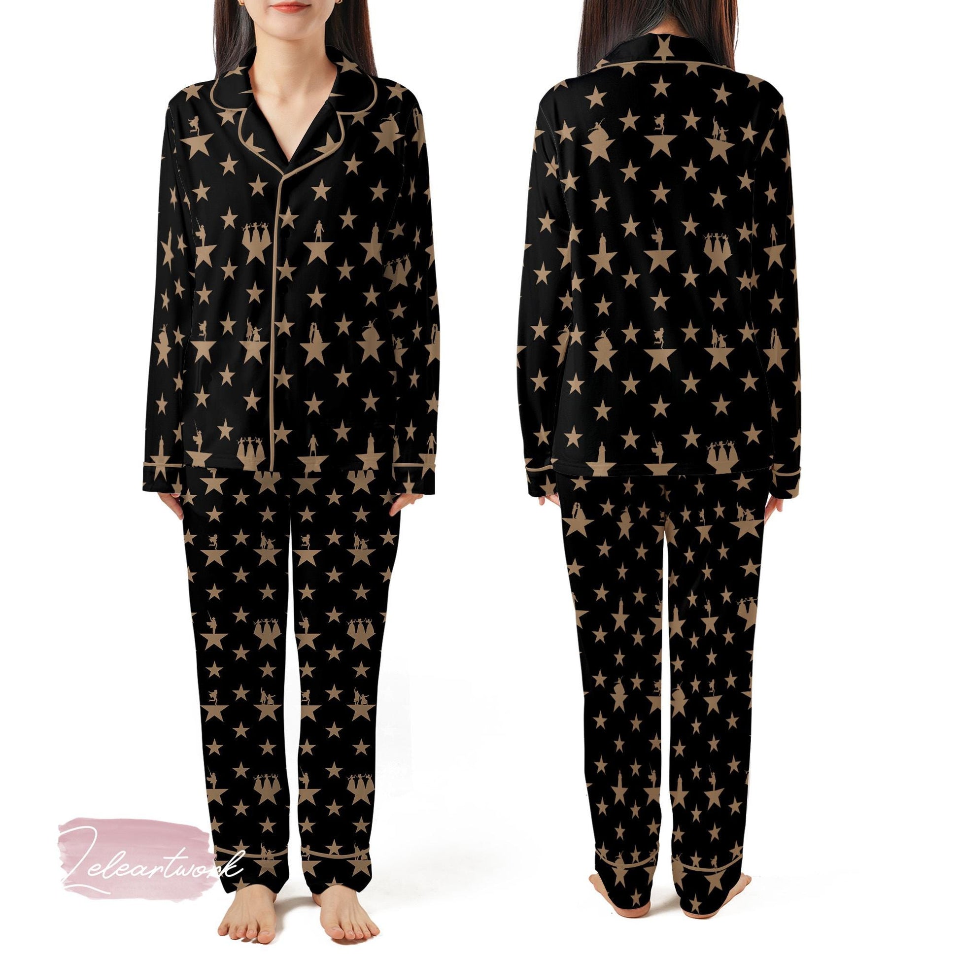 Hamilton Star Silky Satin Pajama Set For Women | Broadway Musical Sleepwear | Gold Star Pattern PJs | Gift for Theater Fans