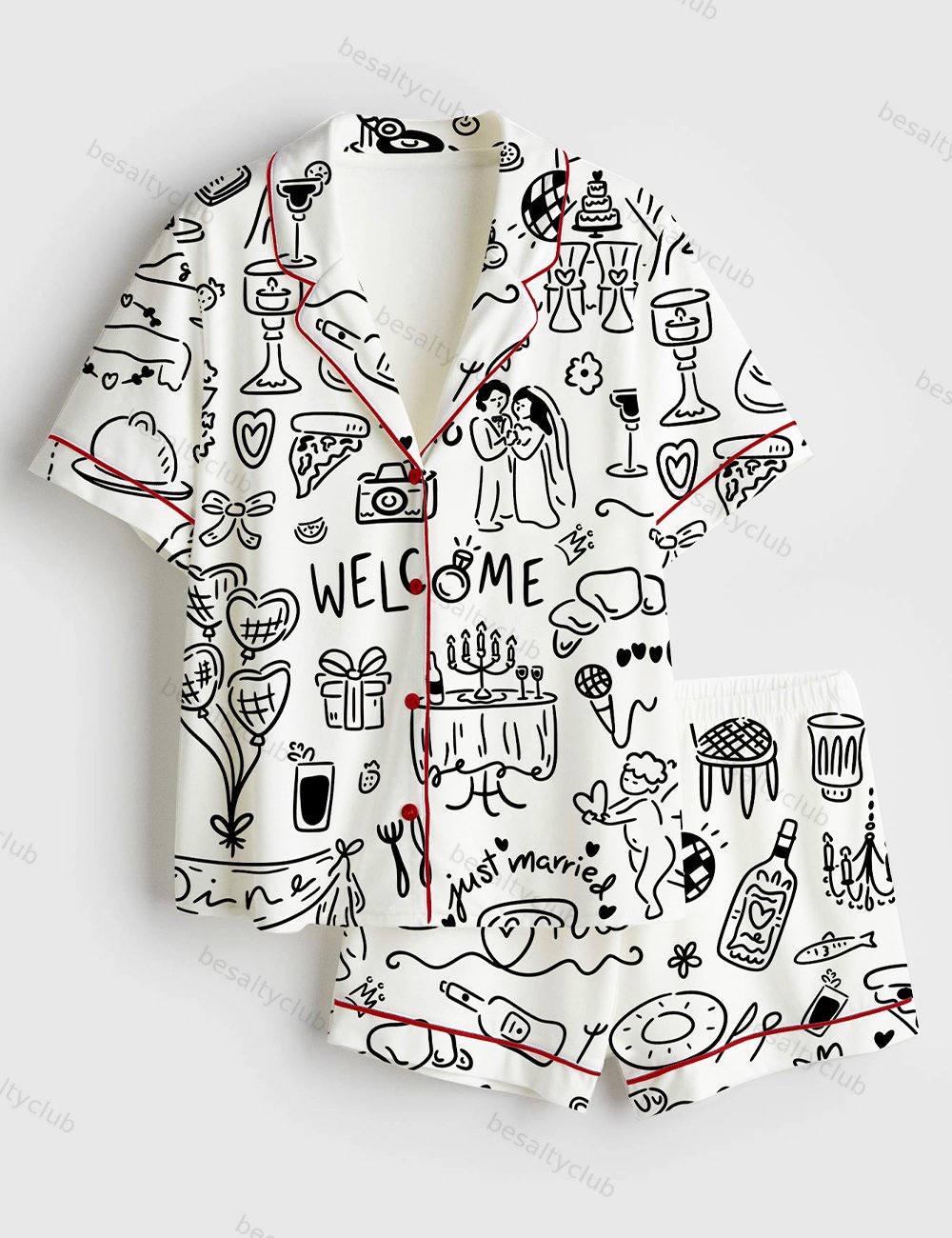 Hand Drawn Whimsical Wedding Bachelorette Print Short Sleeve Satin Pajama Set