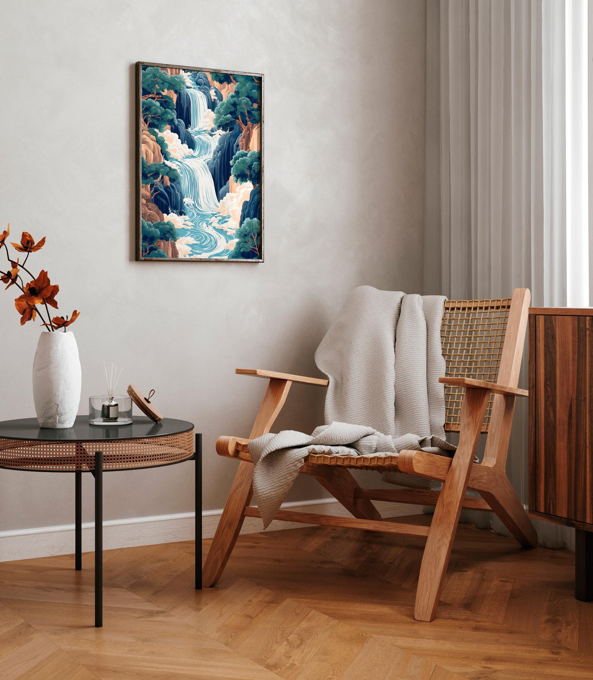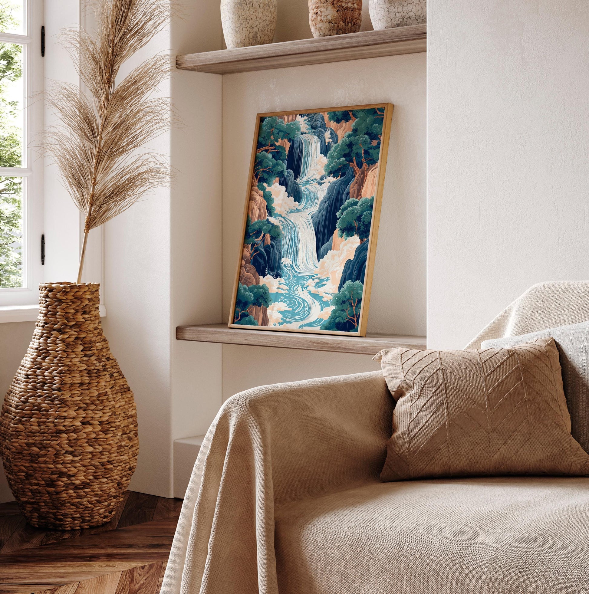 Hokusai Ukiyo-e Japanese waterfall wall art, Landscape poster, Blue green print, Japandi home decor