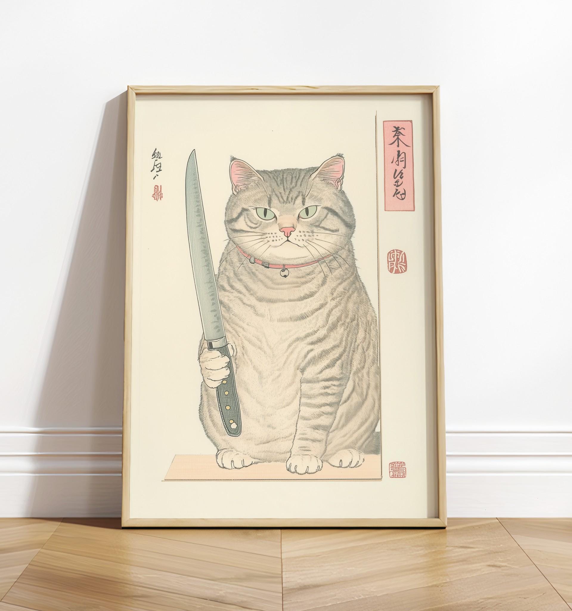 Japanese Cat Print: Funny Tabby Cat with Knife, Ukiyo-e Kitchen Art