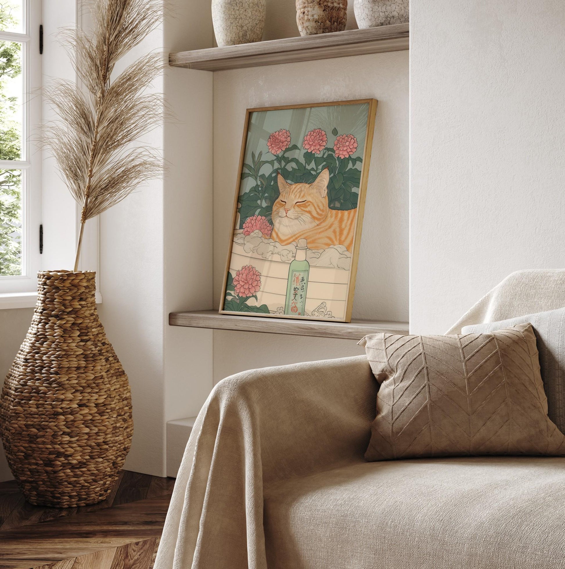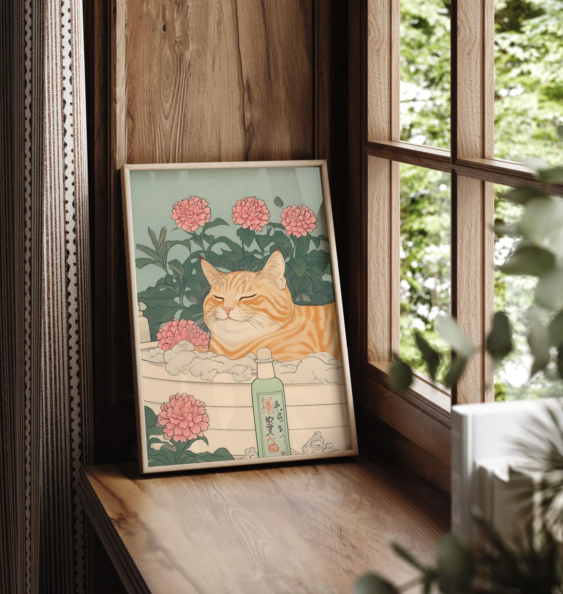 Japanese Cat Print: Ginger Tabby in Bathroom