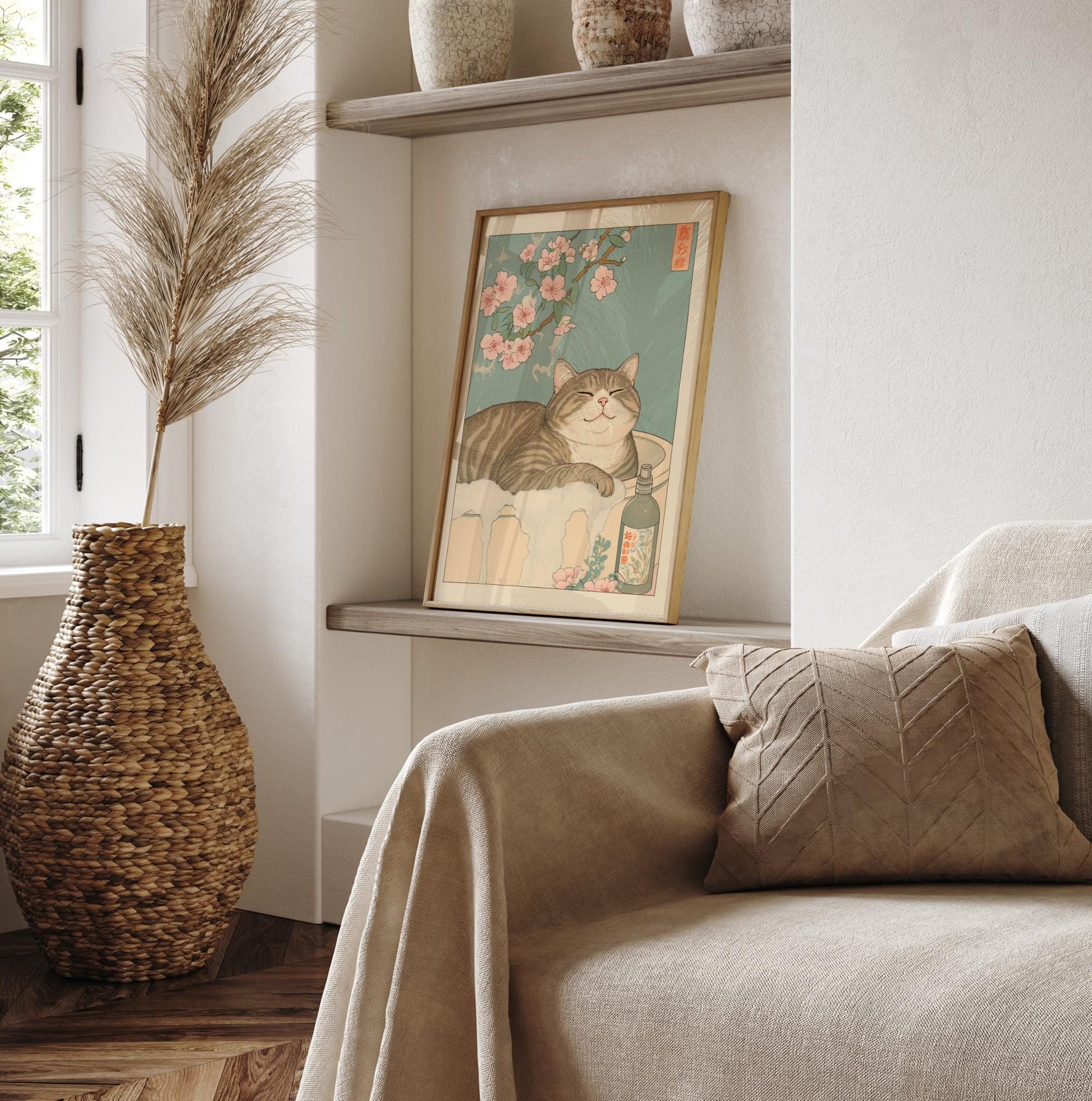 Japanese Ukiyo-e Cat Print: Tabby Cat in Bathtub, Japandi Bathroom Art