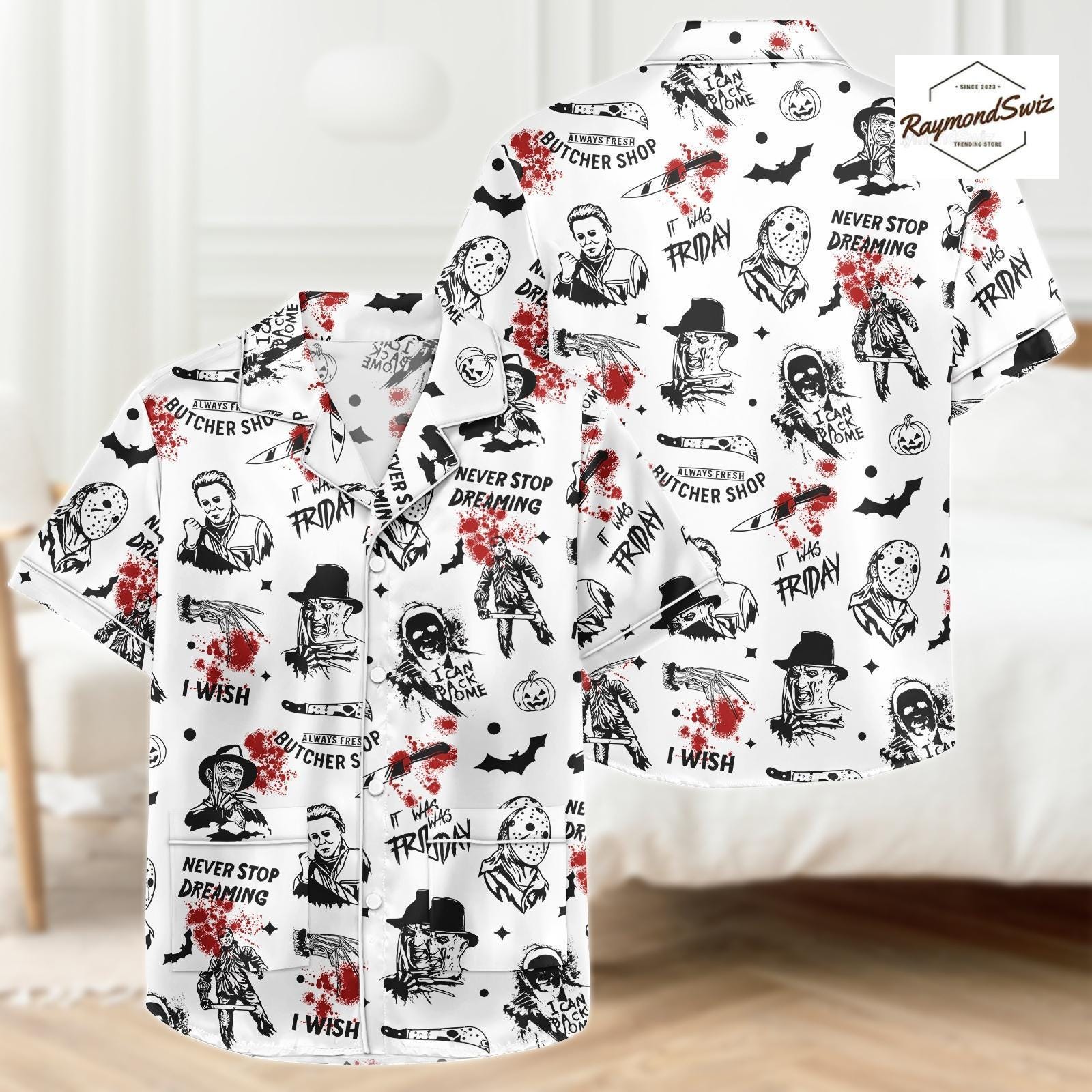 Killer Character Sketch Pajama Set, Halloween Button Shirt PJs, Matching Spooky PJs, Halloween Shorts
