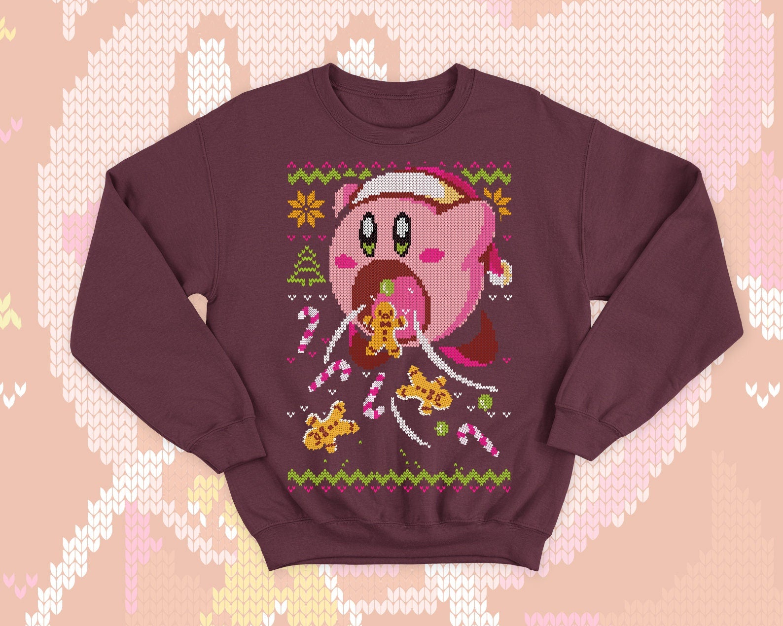 Kirby Ugly Christmas - Kawaii sweatshirt gift - Cute pink hungry Kirby - Sweets and cookies