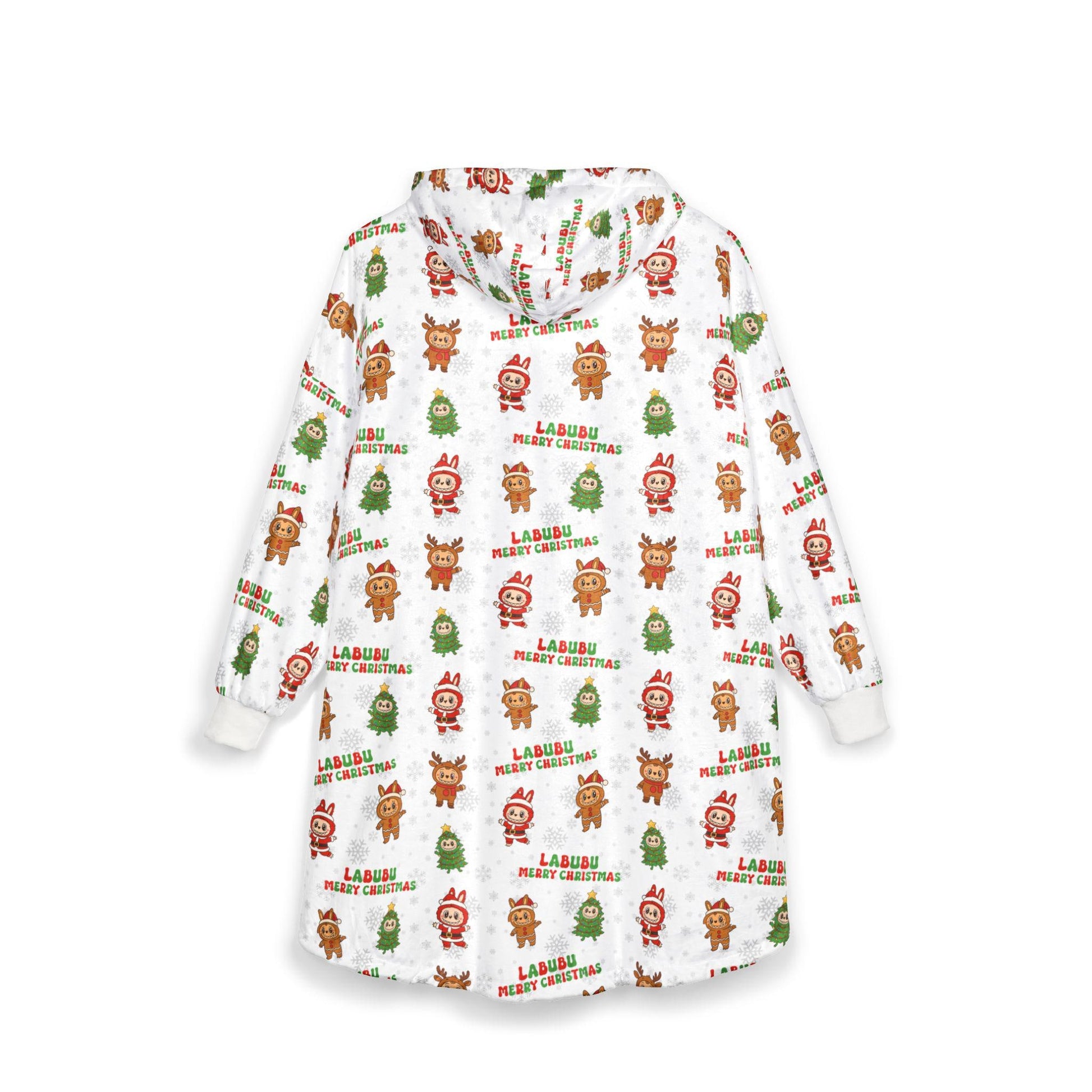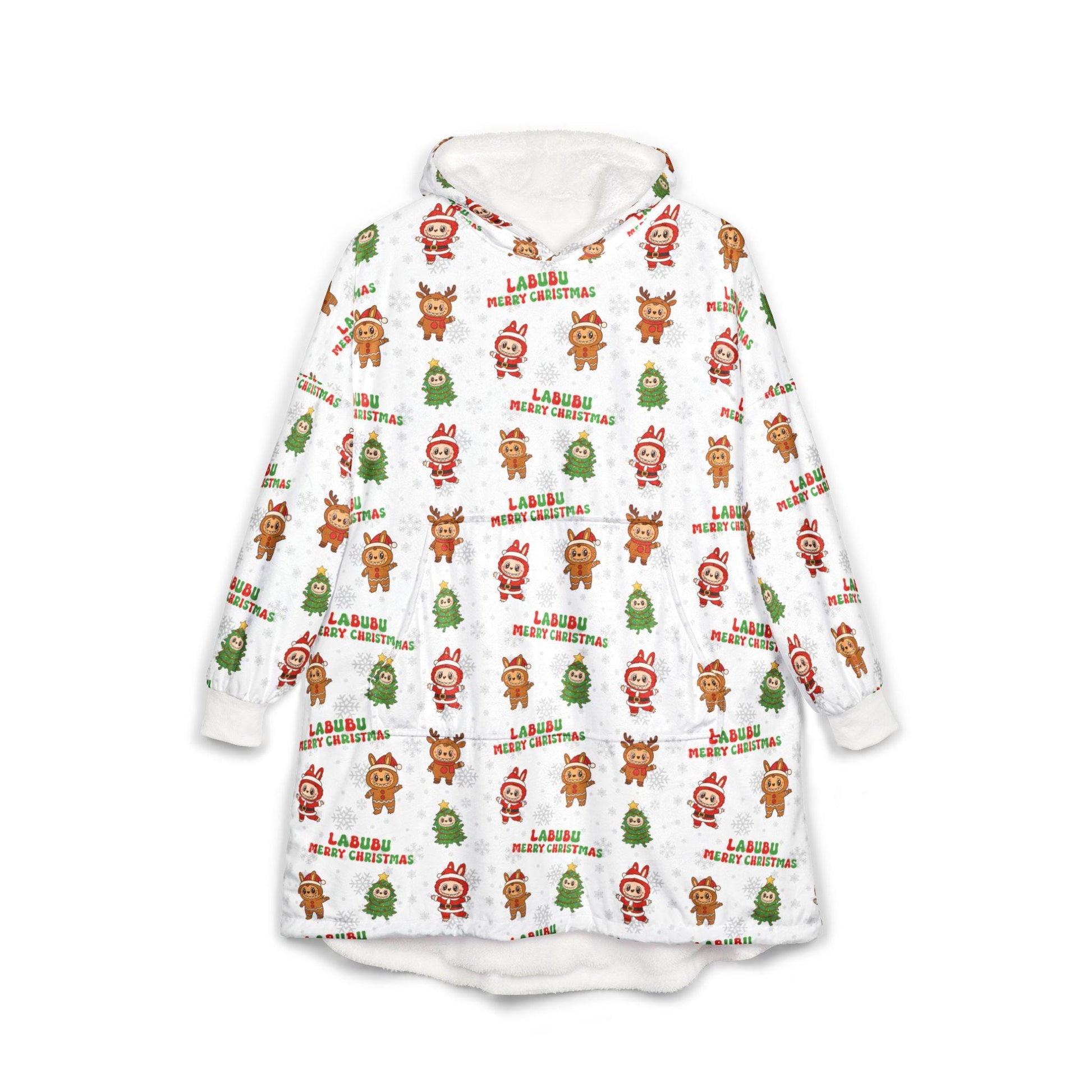 Labubu Christmas Hooded Blanket: Soft Polyester Fleece, Kangaroo Pocket