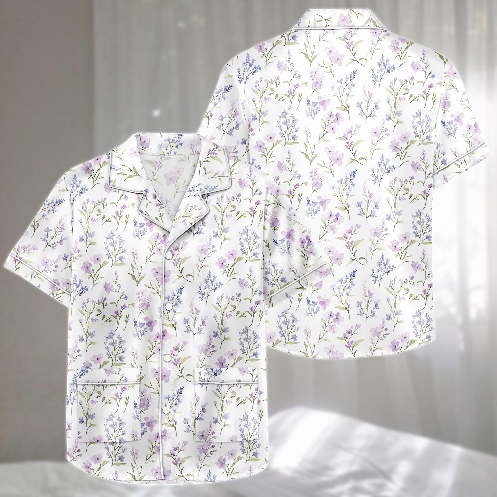Lavender Floral Satin Pajama Short Set, Soft Purple Botanical Sleepwear, Summer Button Nightwear, Cute Holiday Pajamas, Gift For Her