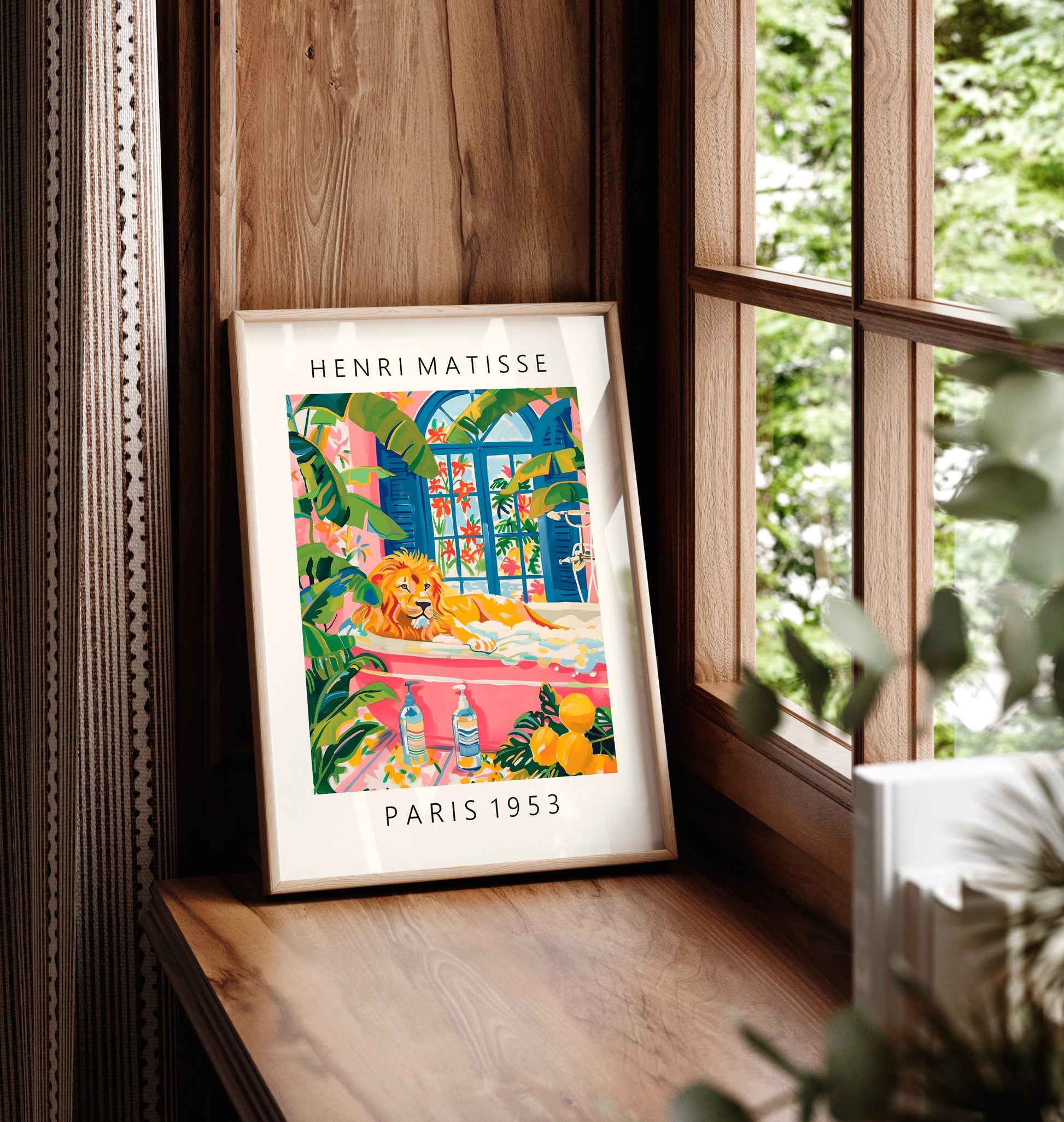 Lion in bathtub poster, Matisse poster, Pink bathroom decor, Animal wall art, Funky decor, Safari art print