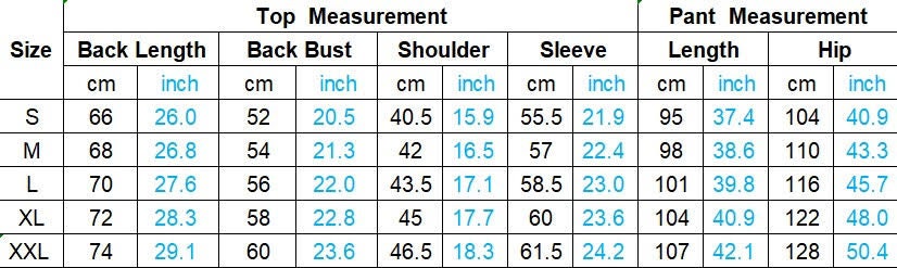 | 1/2 Chest (in/cm) | Length (in/cm) | Sleeve (in/cm) | Waist (in/cm) | Length (in/cm) | Inseam (in/cm) | |