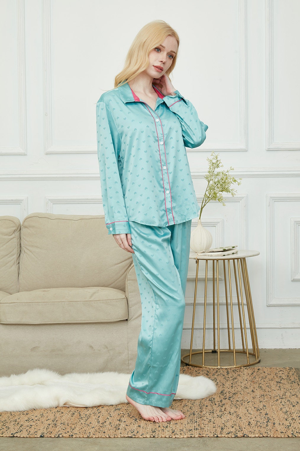 Luxurious Women's Pyjama Set Long Sleeve ,Bride and Bridesmaid Pajama , Gift For Her,Twilight Green With Hearts Print?Could Be Wear Outside