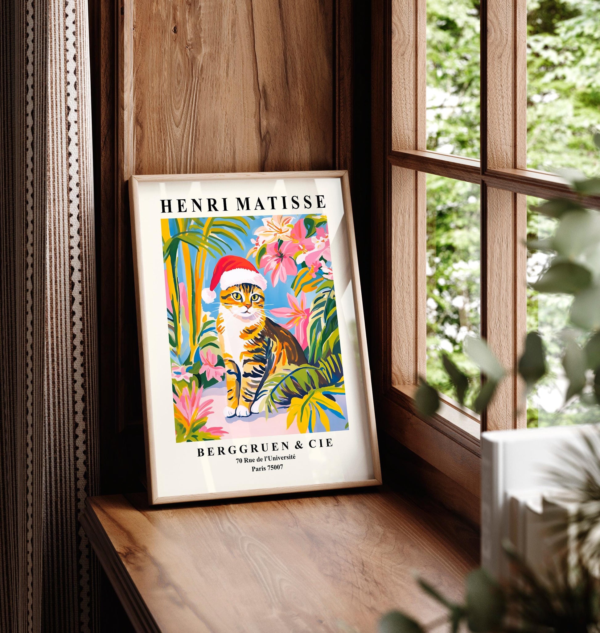 Matisse Cat Print: Grey Tabby in Santa Hat, Christmas Decor