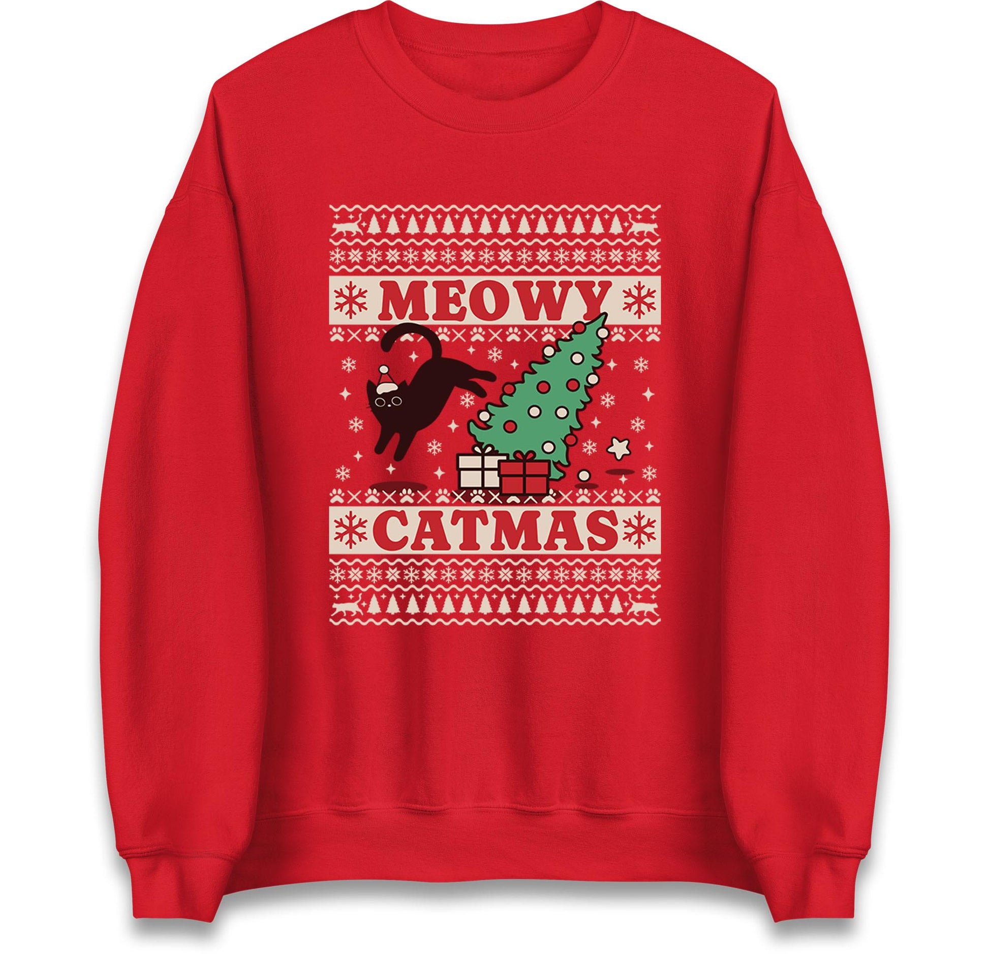 Meowy Catmas Ugly Christmas Jumper with Black Cat Tree Design, Funny Xmas Cat Hoodie, Holiday Cat Lover T Shirt, Kitty Gift Top
