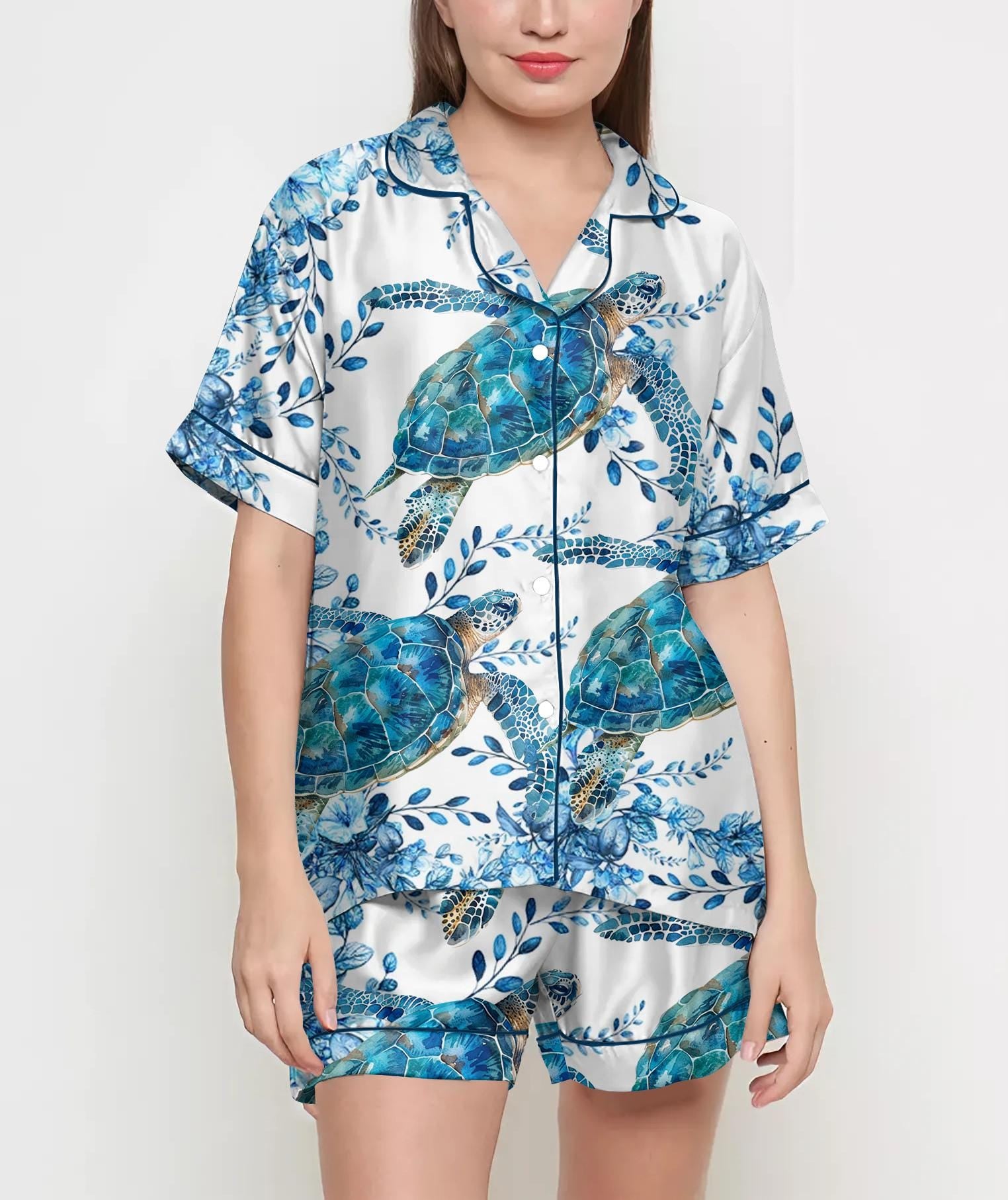 Mom Birthday Gift, Sea Turtle Floral Pajamas Satin Set, Mother's Day Gift, Gift For Her, Gift For Grandma, Birthday Gift, Gift For Women