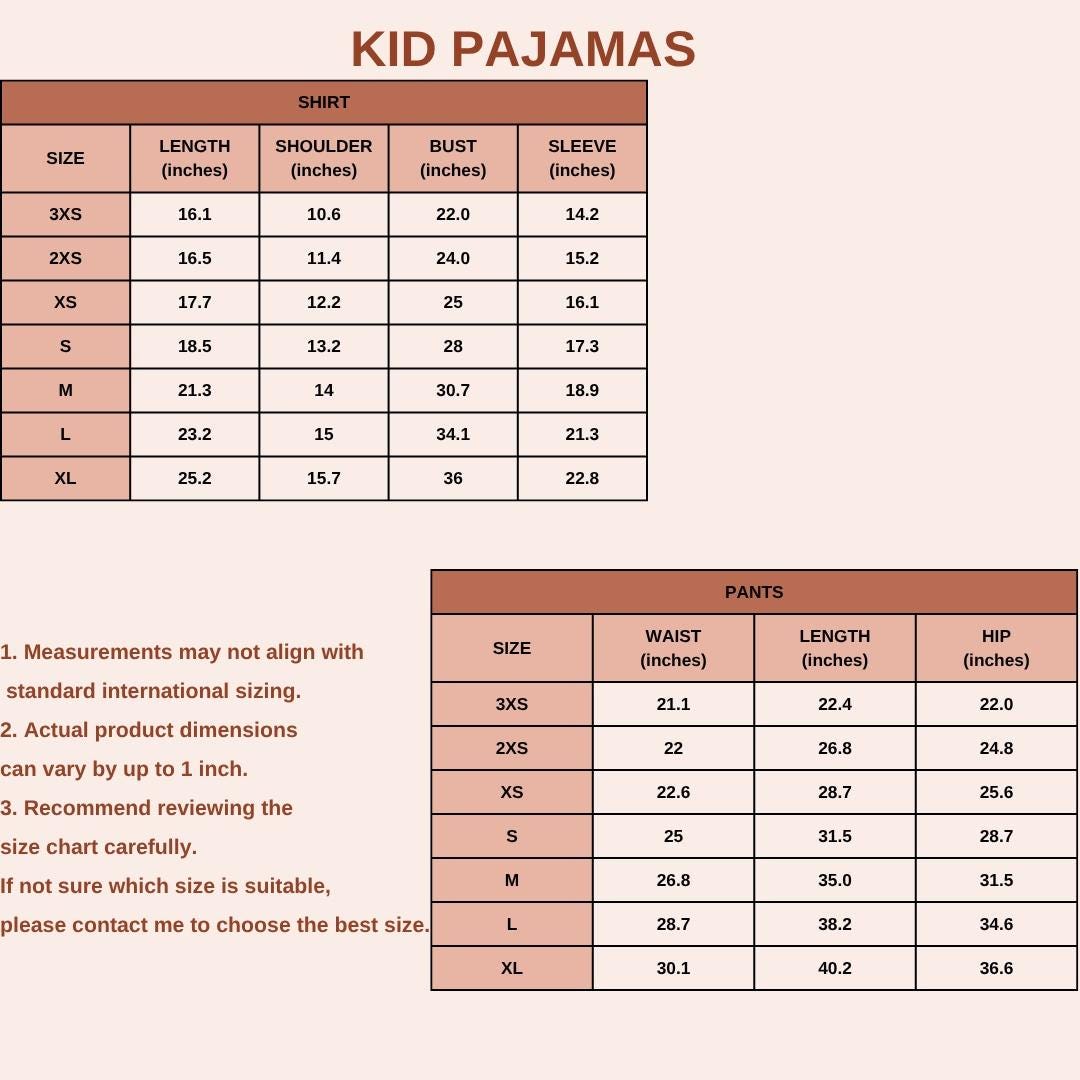 📌 Measurements are garment measurements. For a relaxed fit, compare with a similar PJ your child already wears.