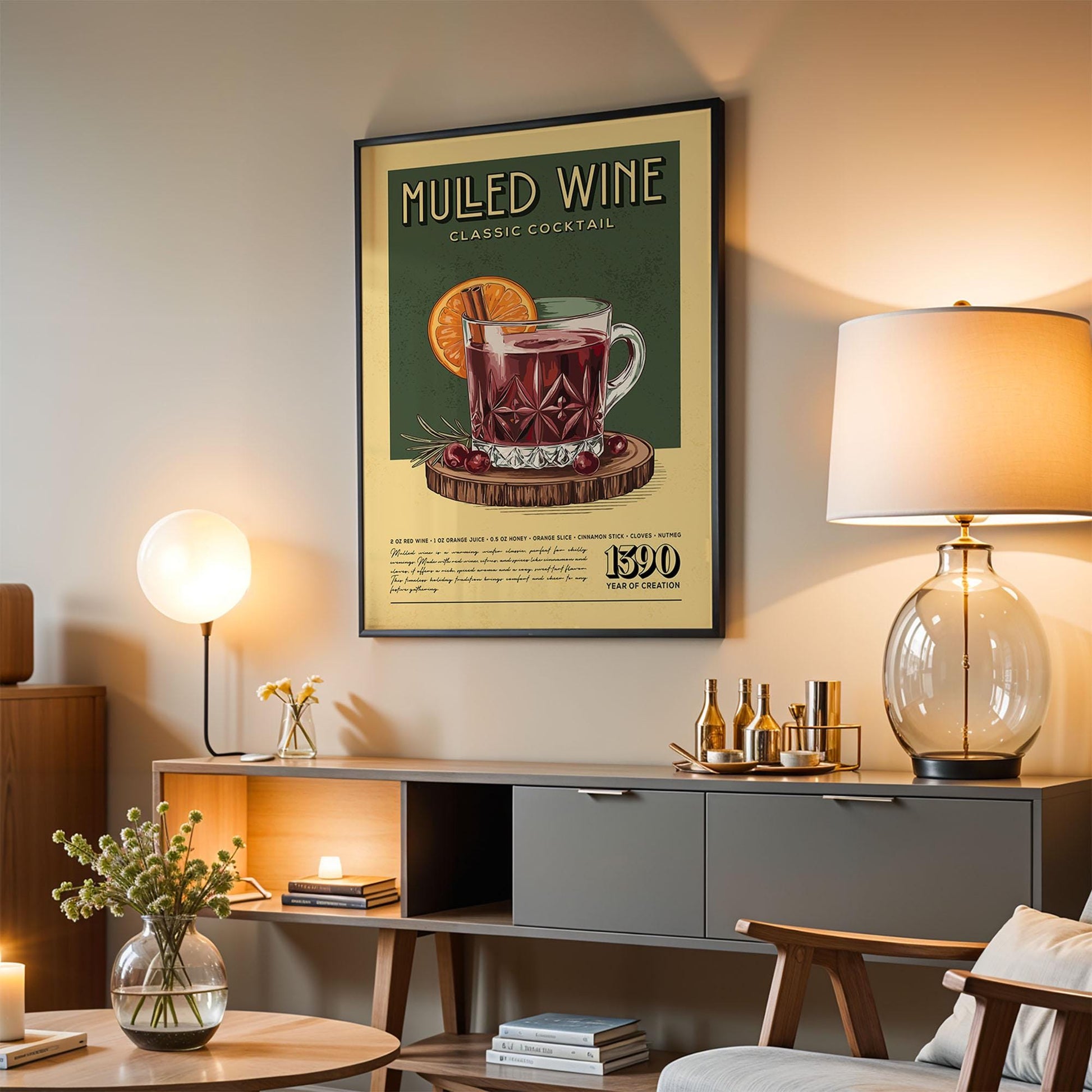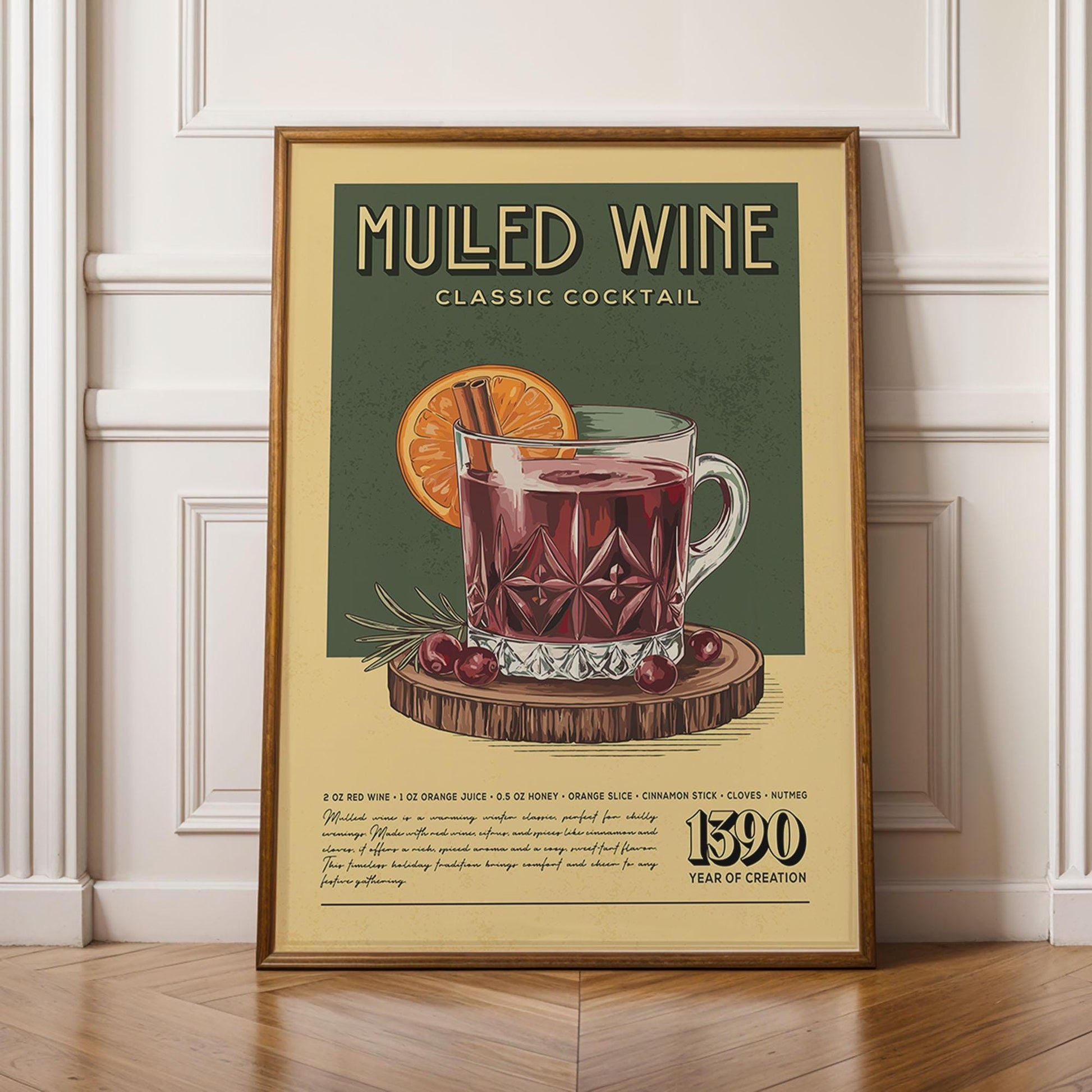 Mulled Wine Cocktail Print, Retro Mulled Wine Cocktail Poster | Bar Cart Prints | Vintage Kitchen Wall Art for Home Bar Cart