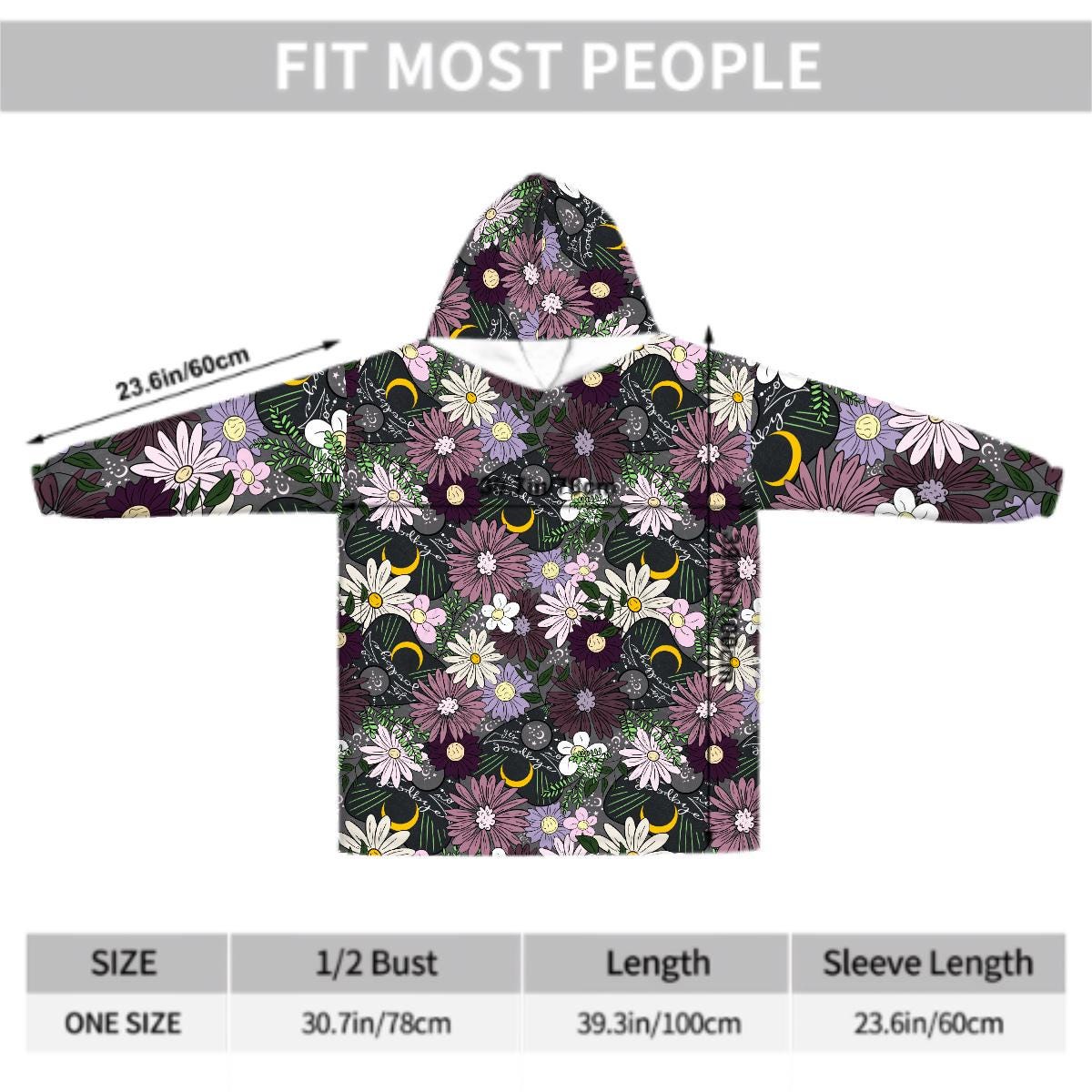 Mystic Wildflower Blanket Hoodie, Purple Pink Boho Witchy Black Hooded Jumper, Moon Gothic Winter Fall Accessory