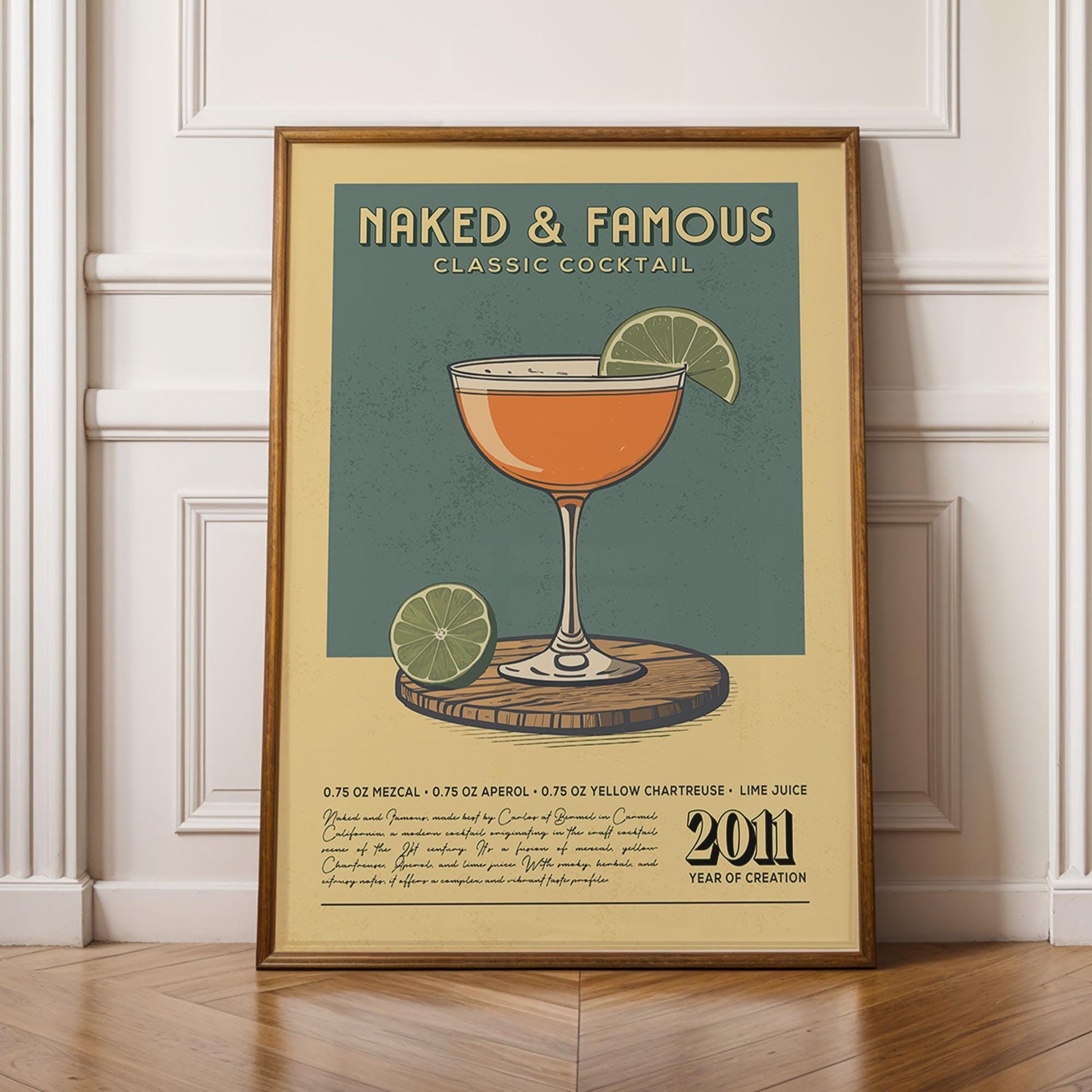 Naked and Famous Cocktail Print, Naked and Famous Cocktail Poster | Bar Cart Prints | Vintage Cocktail Art Bar Accessories for Home Bar Cart