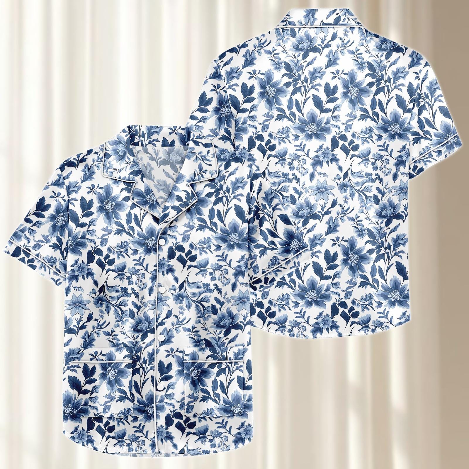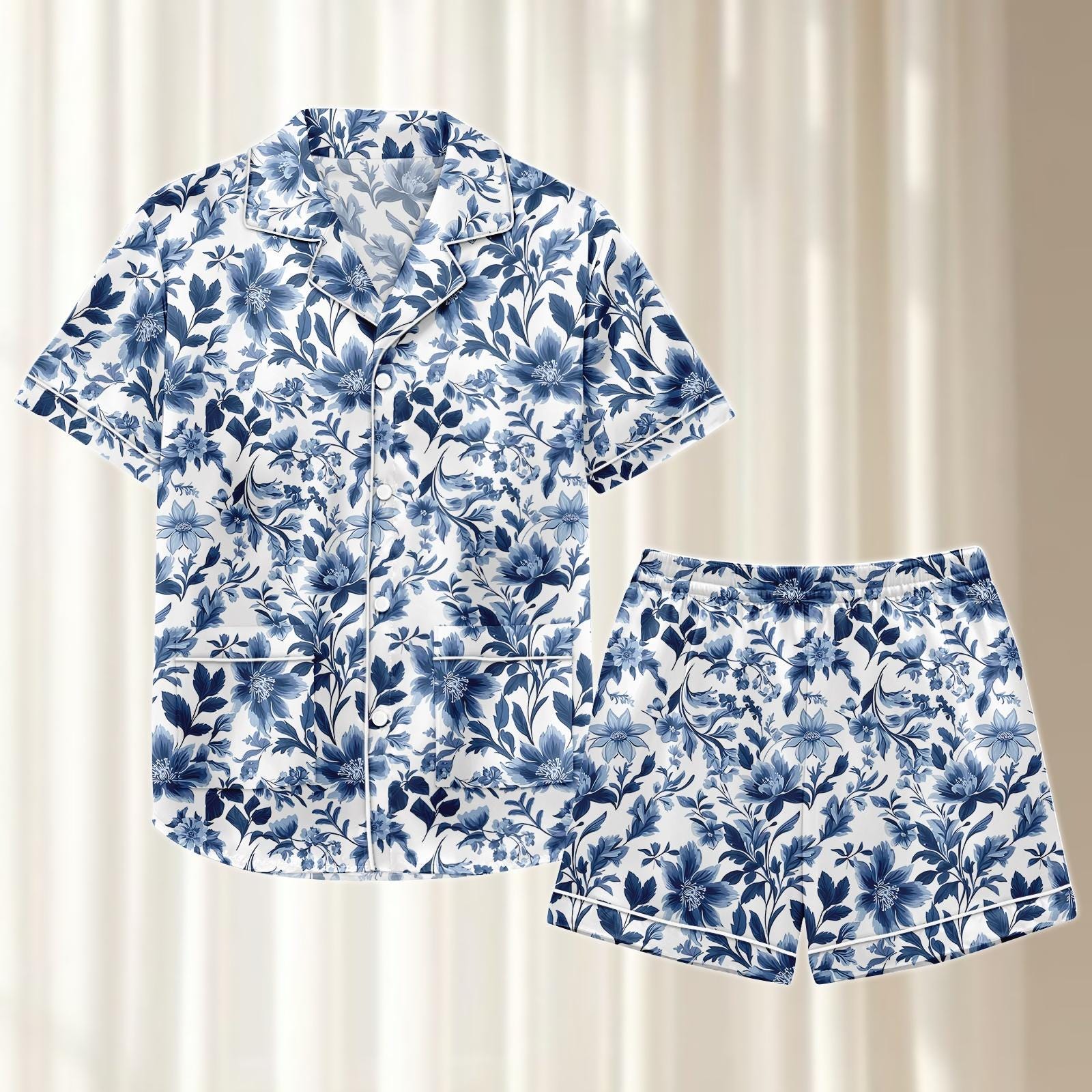 Navy Floral Satin Pajama Set, Elegant Botanical Summer Loungewear, Soft Nightwear Set, Vintage Matching Pjs, Holiday Pjs, Gift For Her