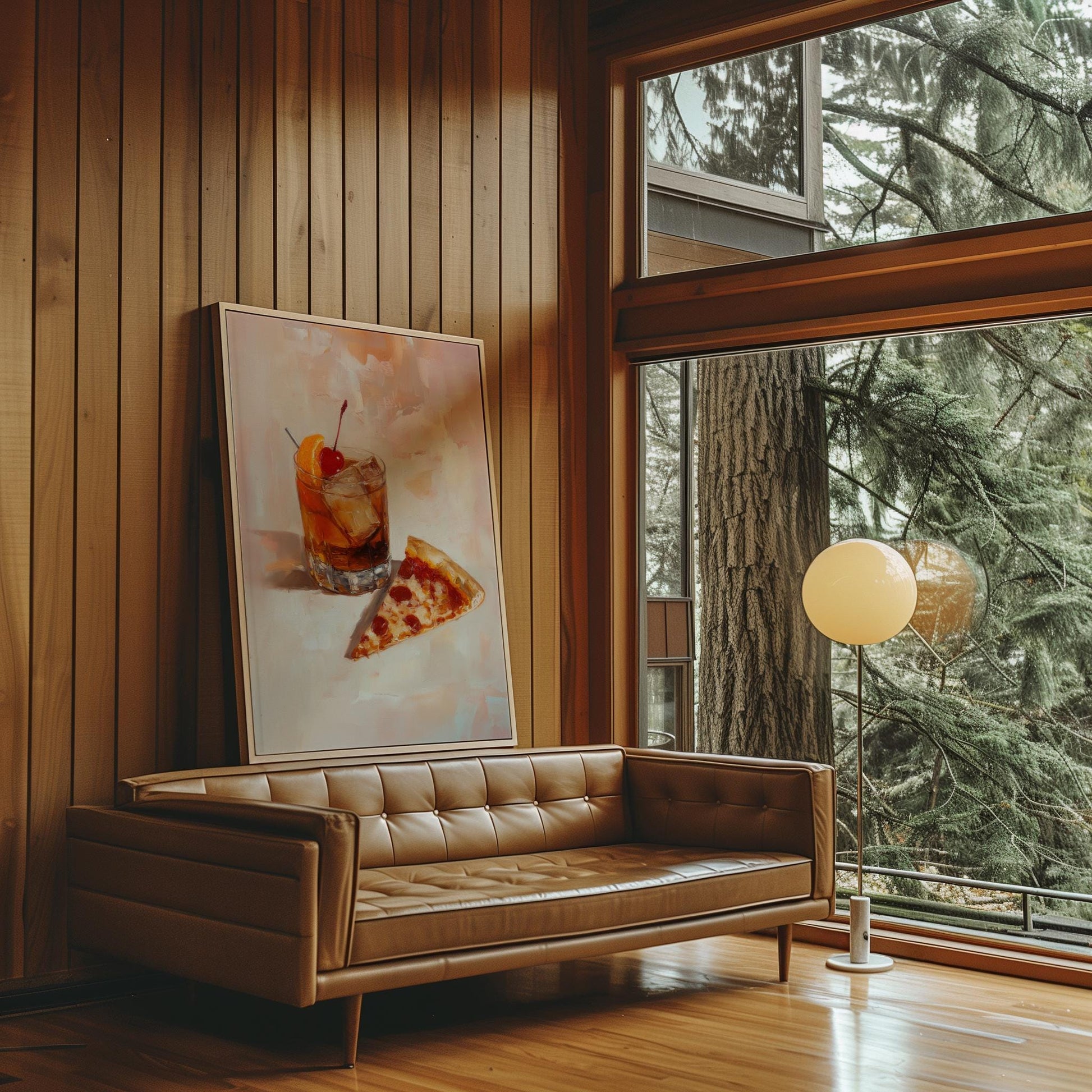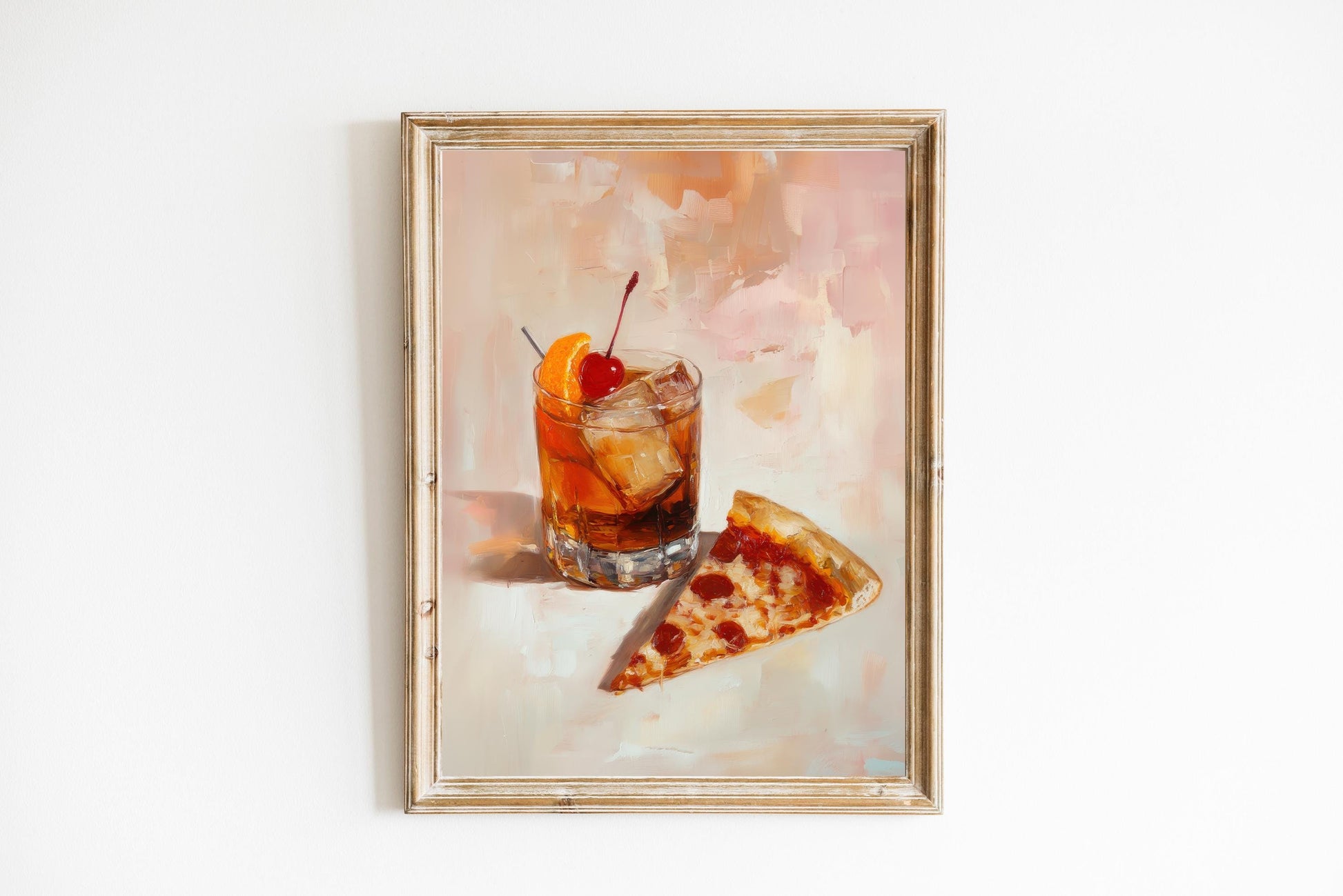 Old Fashioned Cocktail with Pizza Slice Art Print | Cute Quirky Whimsical | Cocktail Bar Cart Decor | Pizza Art Gift | Trendy Home Wall Art