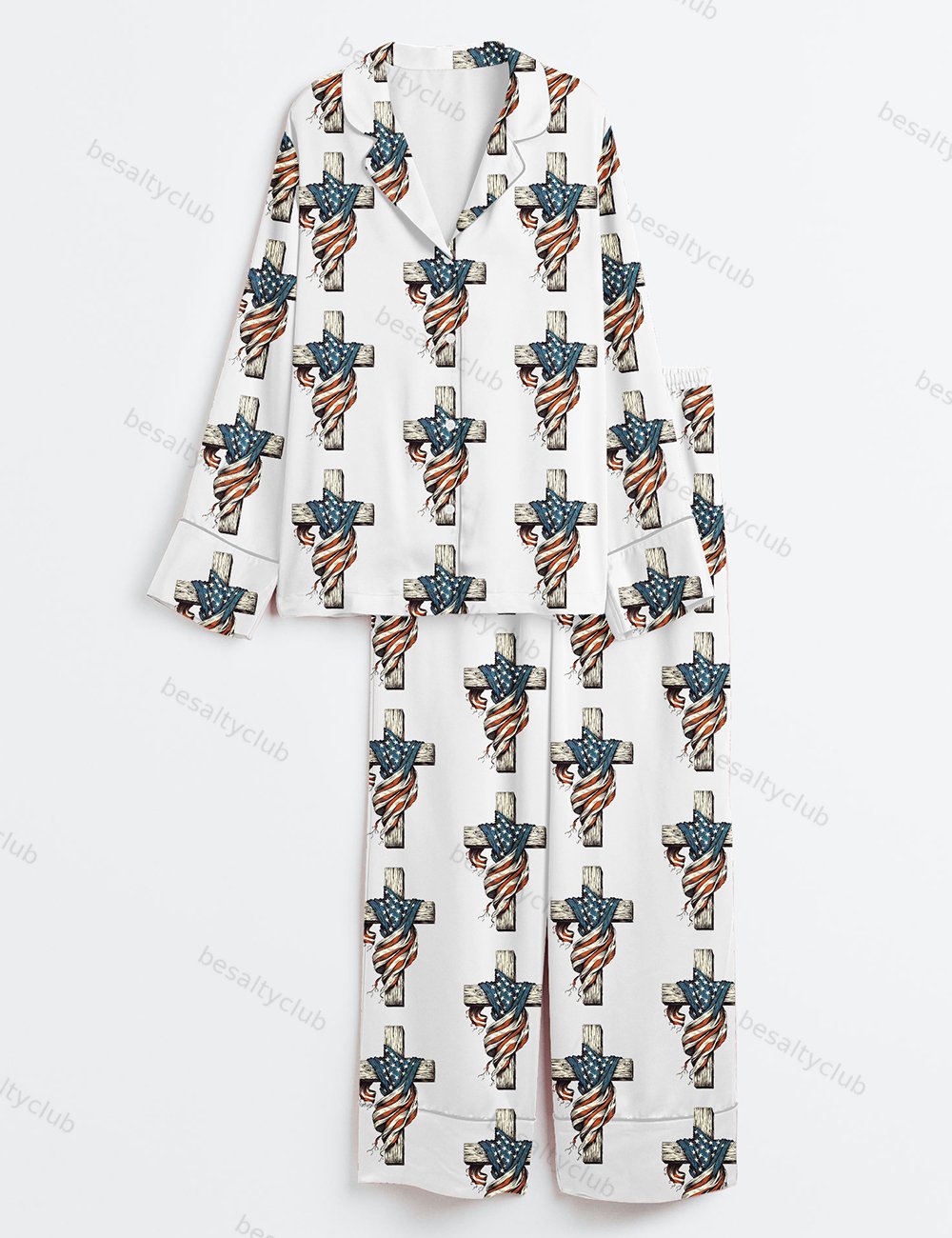 One Nation Under God Patriotic 4th Of July Christian American Flag Cross Long Sleeve Satin Pajama Set