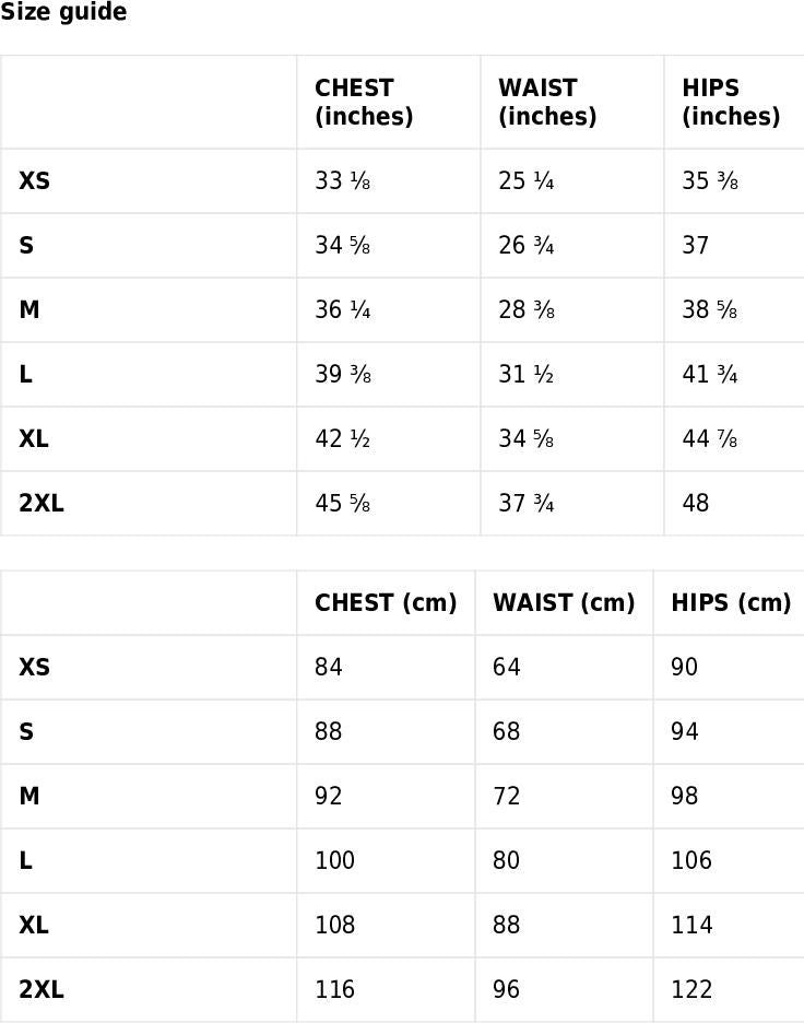 | 2XL | 27.6 / 70.0 | 49.3 / 125.2 | 17.9 / 45.5 | 24.8 / 63.0 | 32.1 / 81.5 | 12.4 / 31.5 | 43.7 / 111.0 |