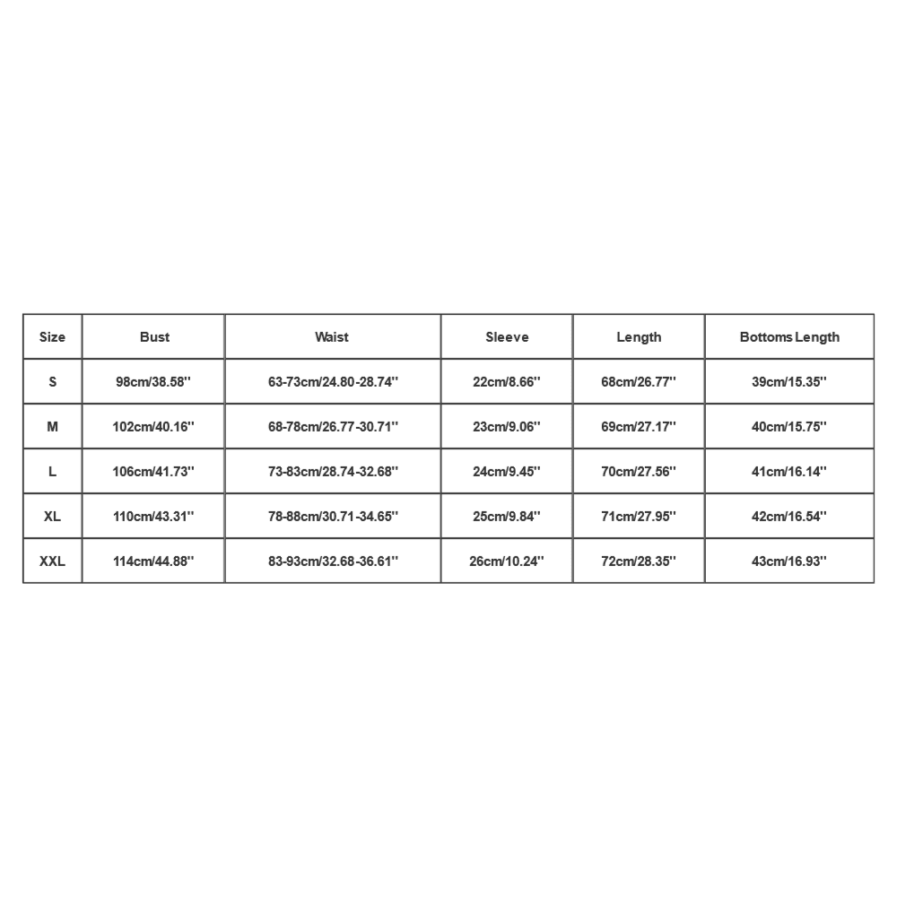 | Size | Top | Shorts | |||||