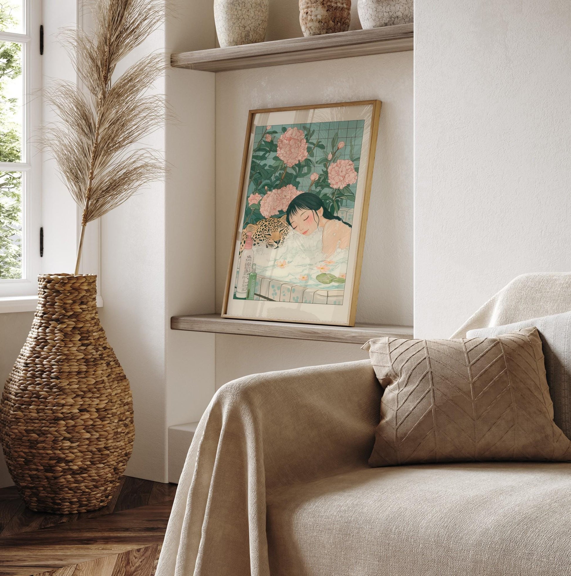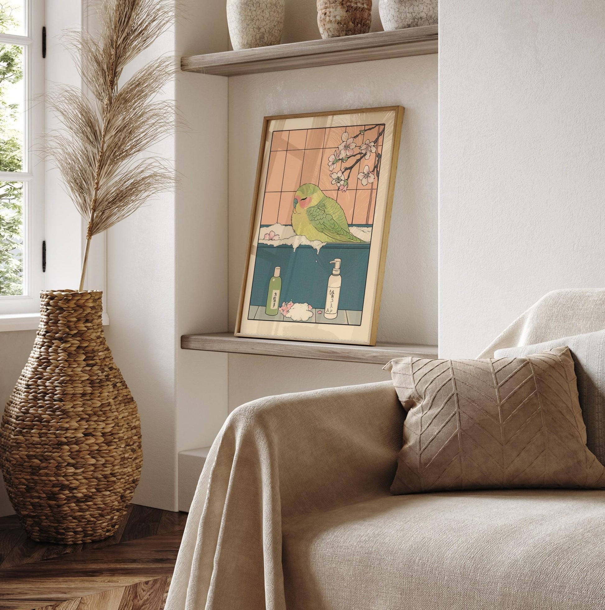 Parakeet in Bathtub Ukiyo-e Print: Funny Bird, Japandi Art