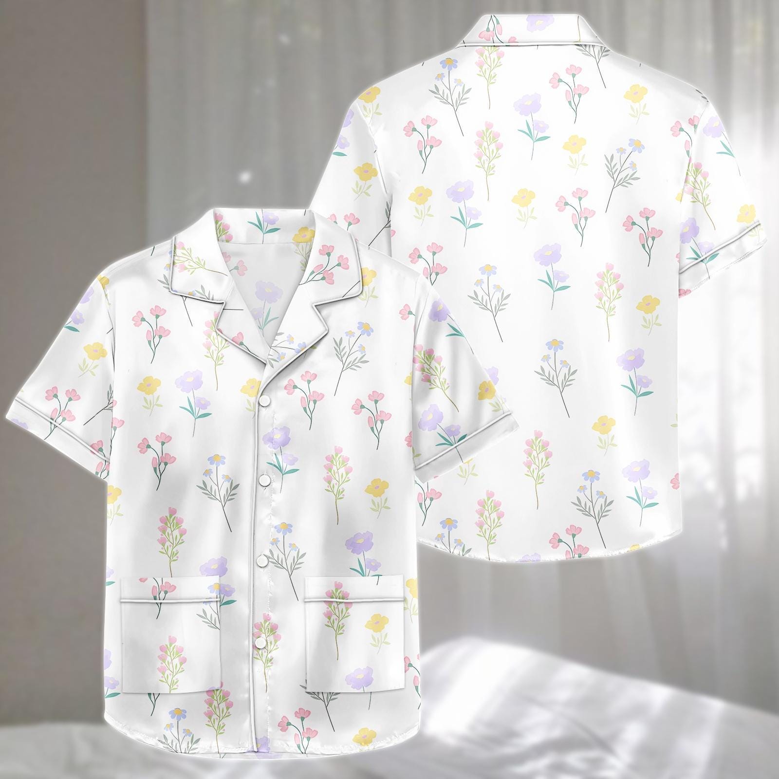Pastel Floral Satin Pajama Short Set, Flowers Women Sleepwear, Nature Lovers Summer Nightwear, Cute Holiday Pajamas, Cute Gift For Her