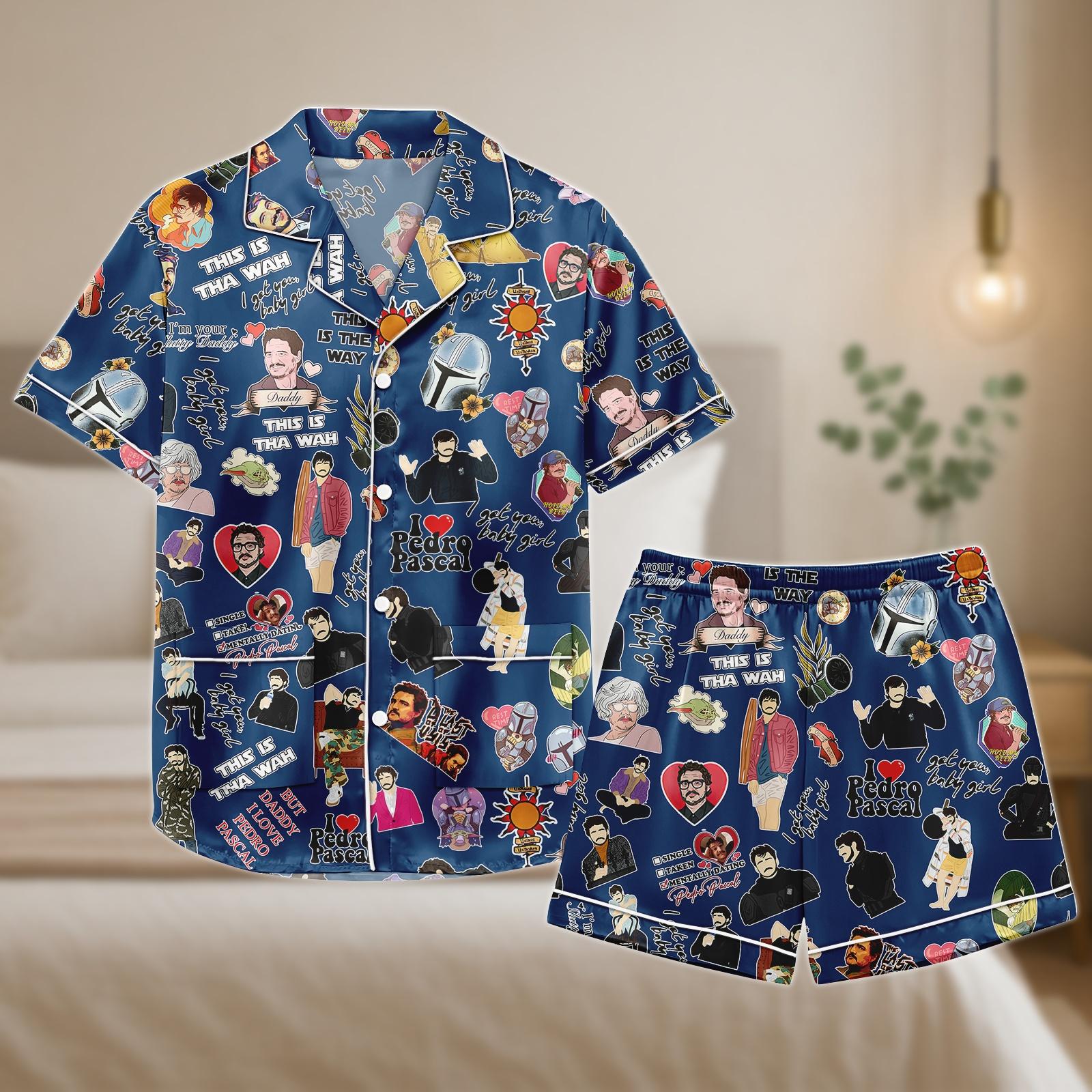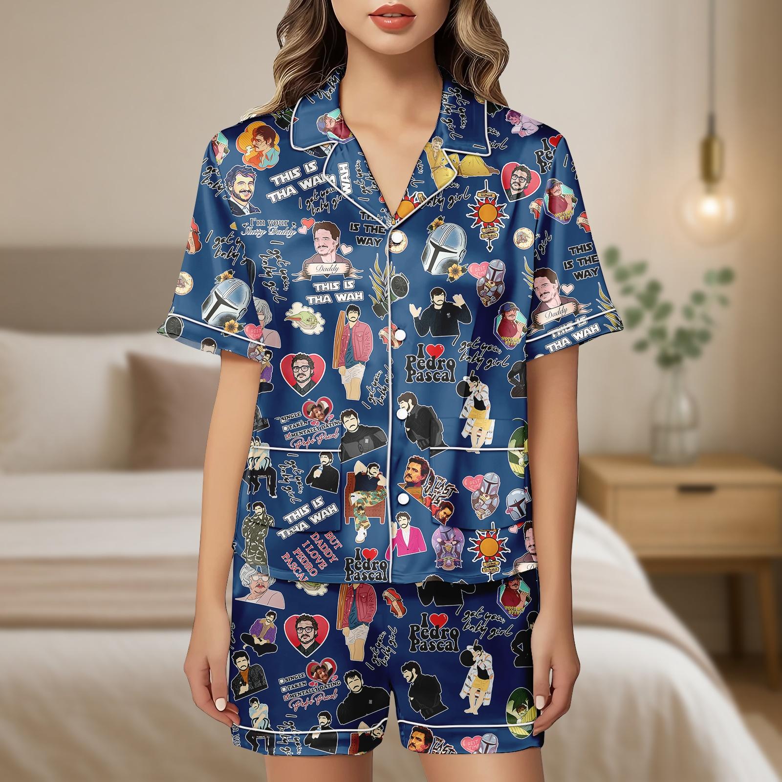 Pedro Pascal Pajama Set, Fan Collage Satin Shorts and Shirt, Funny Celebrity Sleepwear, Pop Culture Lounge Gift for Her
