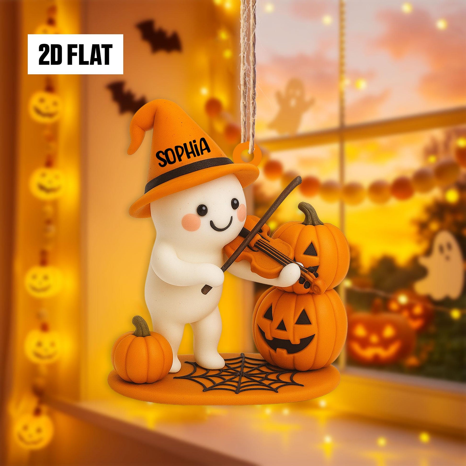Personalized Halloween Ornament – Cute Ghost With Pumpkin Vilon, Custom Name Ornament 2D Flat, Fun And Spooky Halloween Hanging Window