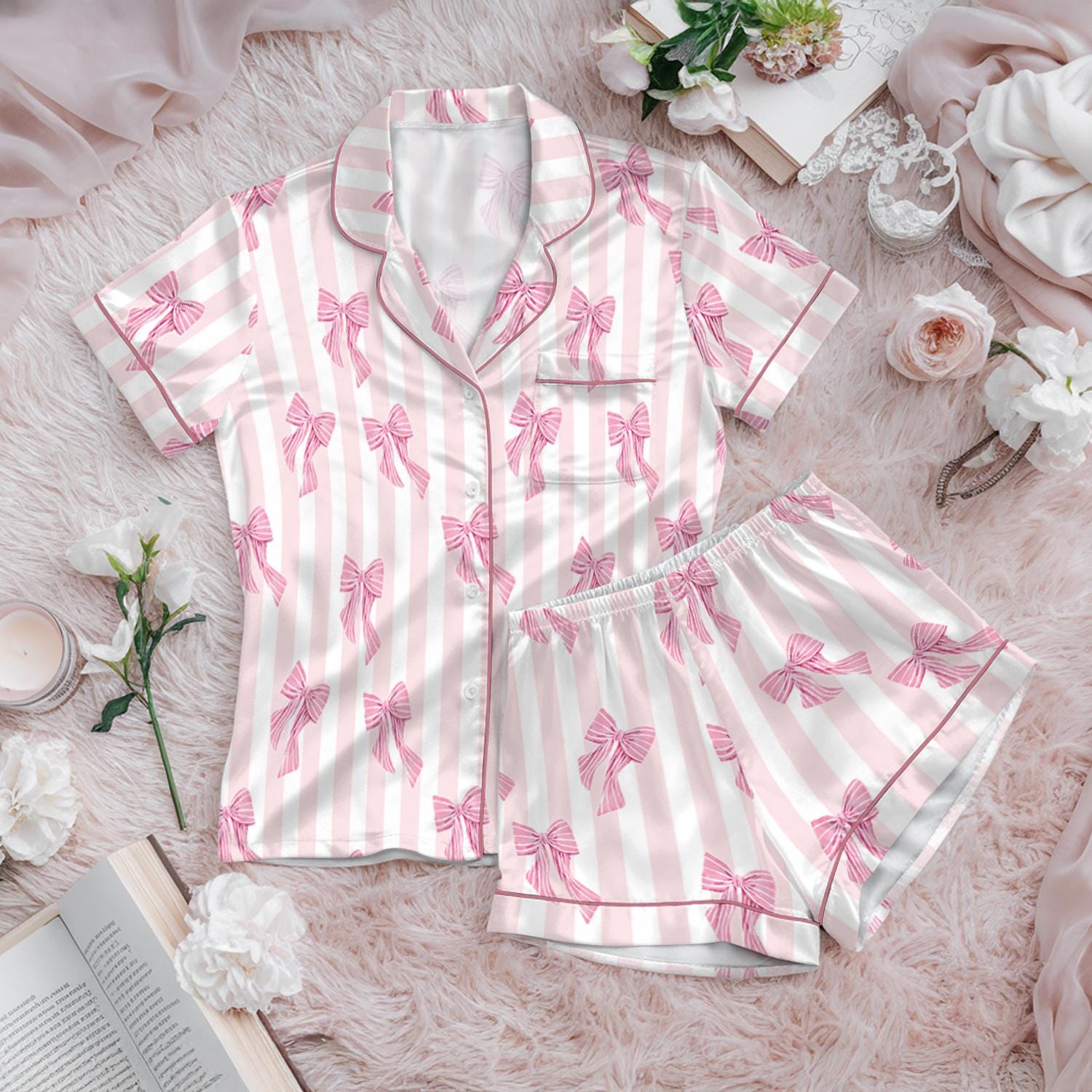 Personalized Name Pink Bow Coquette Satin Pajama Set, Custom Coquette Bow Pajamas, Cute Ribbon Lounge Set
