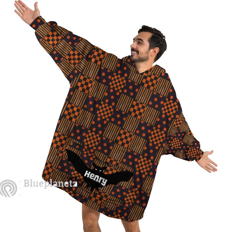 Personalized Wearable Hoodies Blanket, Custom Name Halloween Pattern Hoodie Blanket, Custom Halloween Bat Oversized Blanket, Gift