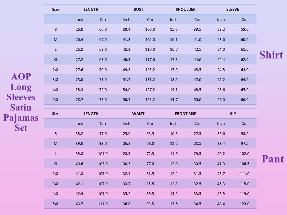 | 1/2 Chest (in/cm) | Length (in/cm) | Sleeve (in/cm) | Waist (in/cm) | Length (in/cm) | Inseam (in/cm) | |